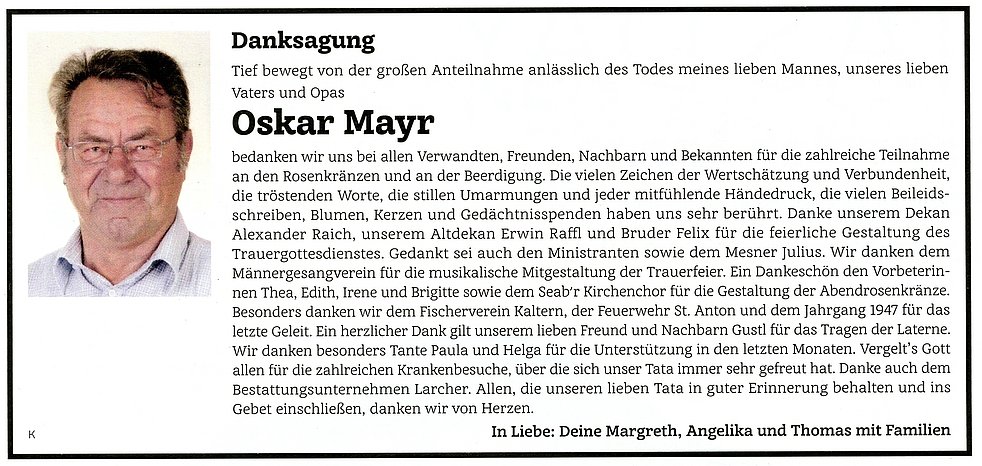 Allen, die an den Rosenkränzen und an der Beerdigung teilnehmen im Voraus ein herzliches Vergelt´s Gott.