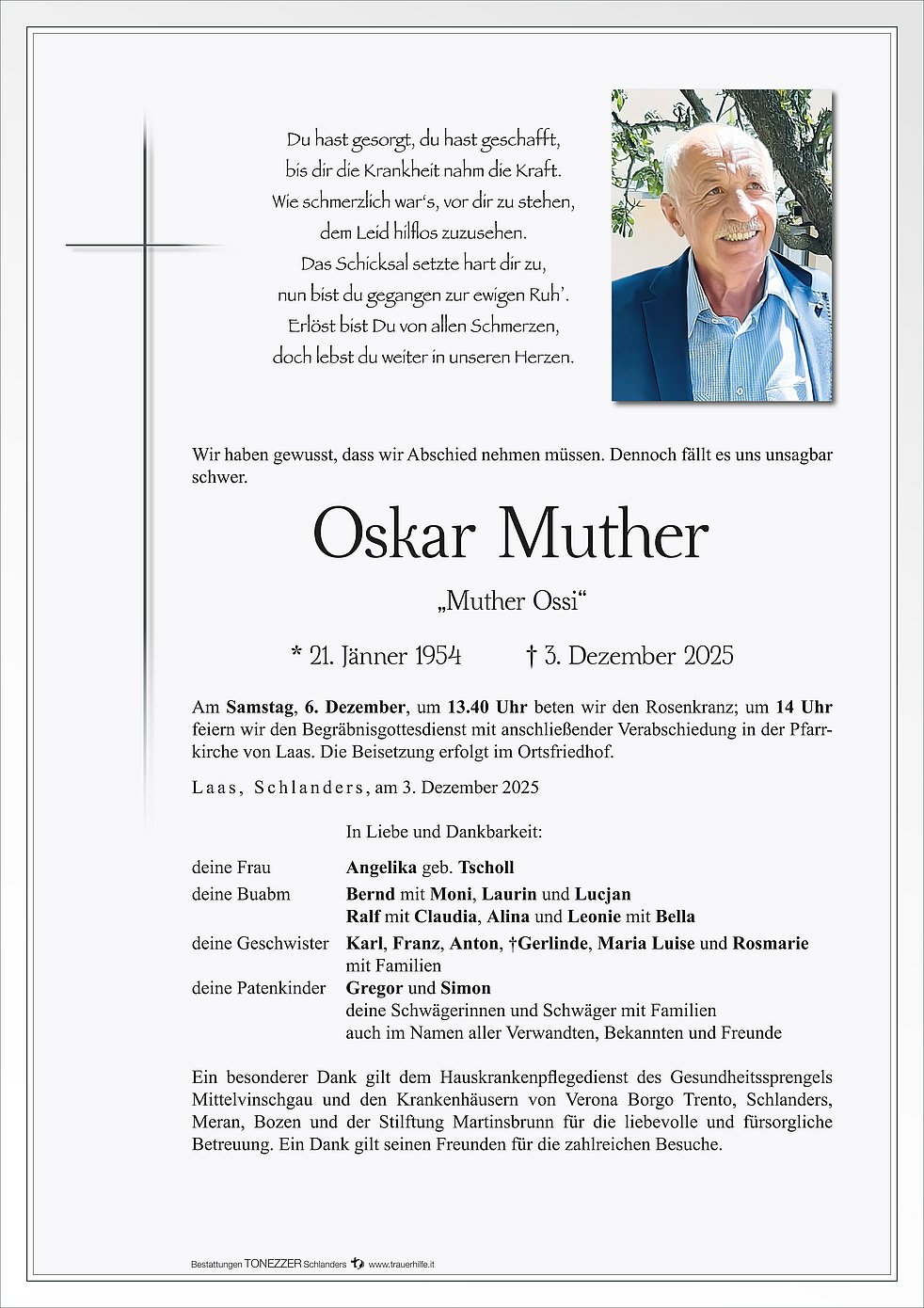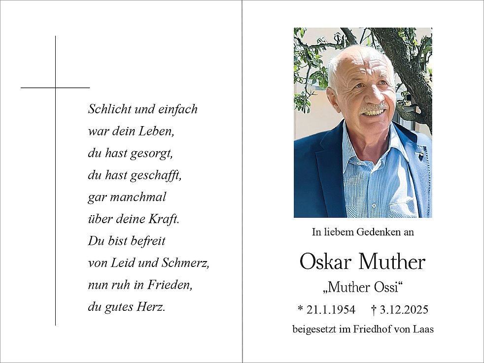 Am Samstag, 6. Dezember, um 13.40 Uhr beten wir den Rosenkranz; um 14 Uhr feiern wir den Begräbnisgottesdienst mit anschließender Verabschiedung in der Pfarrkirche von Laas. Die Beisetzung erfolgt im Ortsfriedhof.