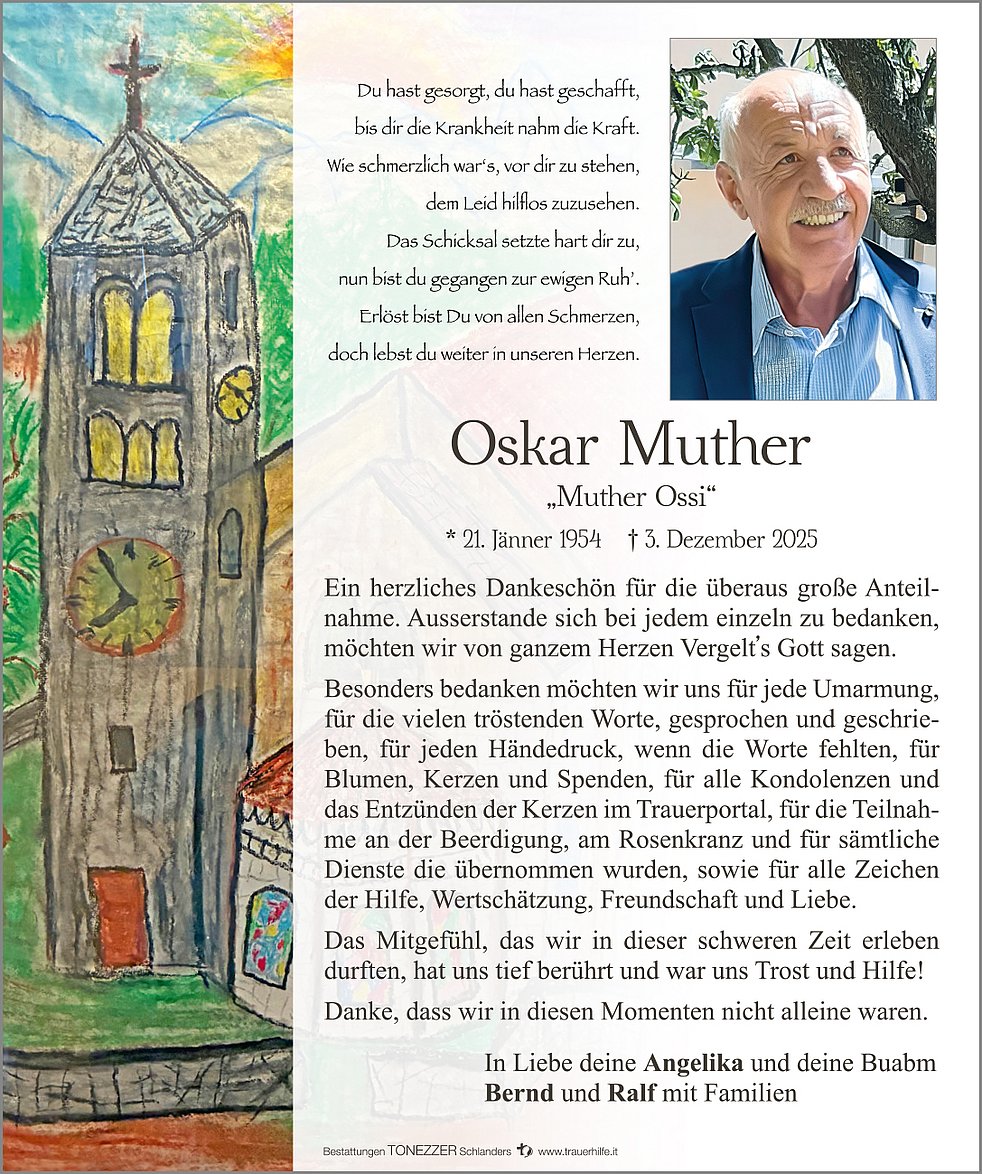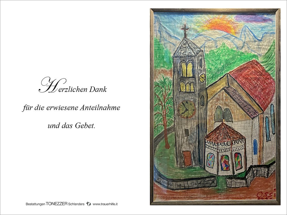 Ein besonderer Dank gilt dem Hauskrankenpflegedienst des Gesundheitssprengels Mittelvinschgau und den Krankenhäusern von Verona Borgo Trento, Schlanders, Meran, Bozen und der Stilftung Martinsbrunn für die liebevolle und fürsorgliche Betreuung.