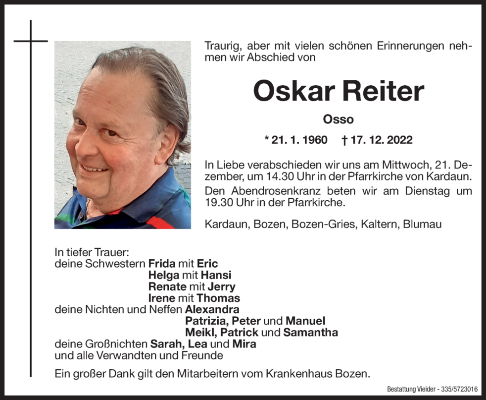 In Liebe verabschieden wir uns am Mittwoch, 21. Dezember um 14.30 Uhr in der Pfarrkirche von Kardaun.