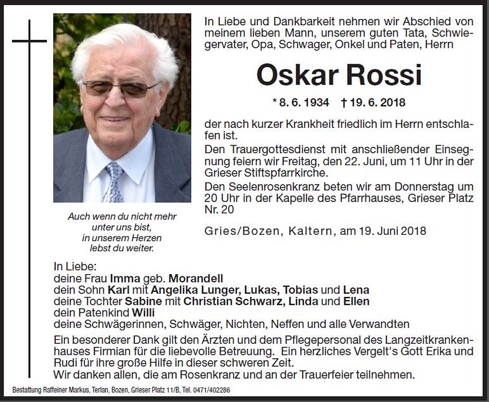 Den Trauergottesdienst mit anschlieβender Einsegnung feiern wir Freitag, den 22. Juni, um 11 Uhr in der Grieser Stiftspfarrkirche.