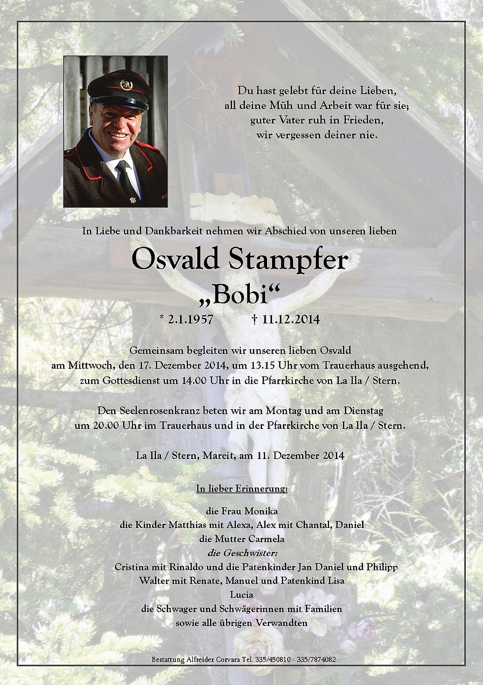 am Mittwoch, den 17. Dezember 2014, um 13.15 Uhr vom Trauerhaus ausgehend, zum Gottesdienst um 14.00 Uhr in die Pfarrkirche von La Ila / Stern.