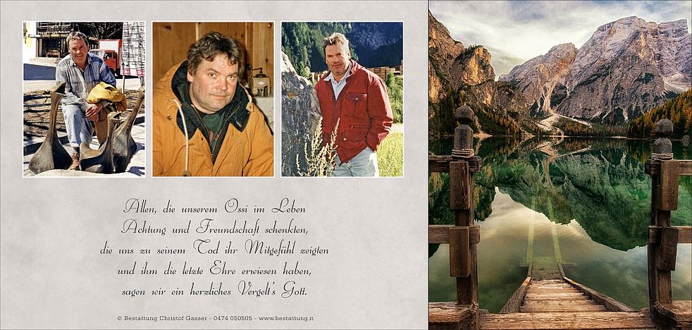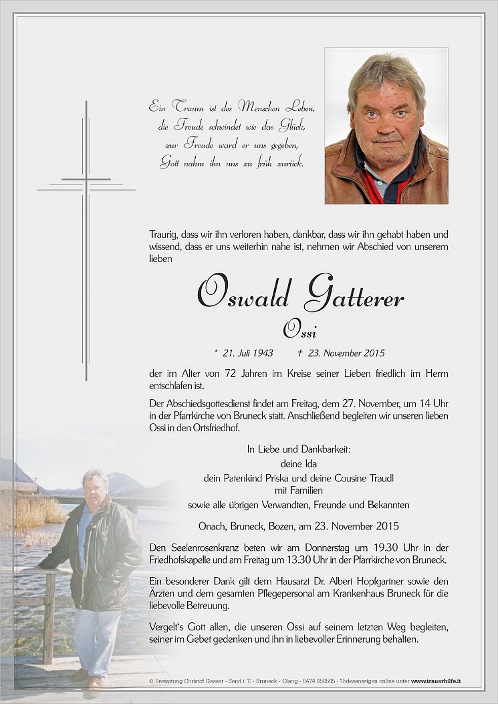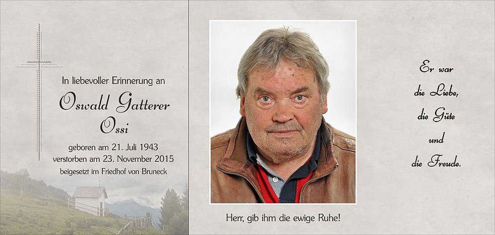 Der Abschiedsgottesdienst findet am Freitag, dem 27. November, um 14 Uhr in der Pfarrkirche von Bruneck statt. Anschließend begleiten wir unseren lieben Ossi in den Ortsfriedhof.