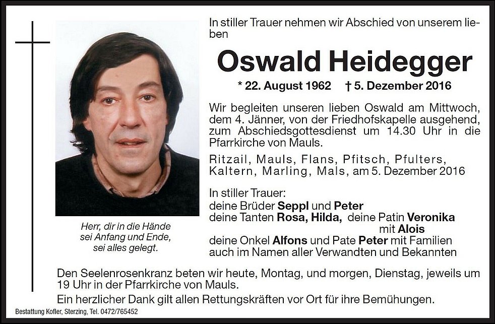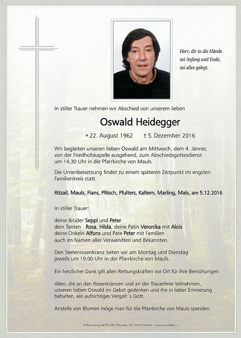 Wir begleiten unseren lieben Oswald am Mittwoch, dem 4. Jänner, von der Friedhofskapelle ausgehend, zum Abschiedsgottesdienst um 14.30 Uhr in die Pfarrkirche von Mauls.