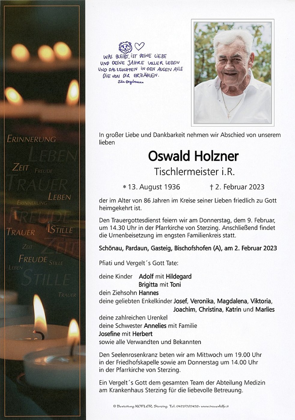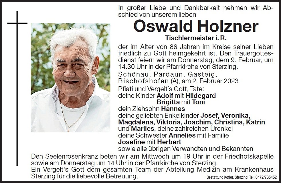 Den Trauergottesdienst feiern wir am Donnerstag, dem 9. Februar, um 14.30 Uhr in der Pfarrkirche von Sterzing. Anschließend findet die Urnenbeisetzung im engsten Familienkreis statt.
