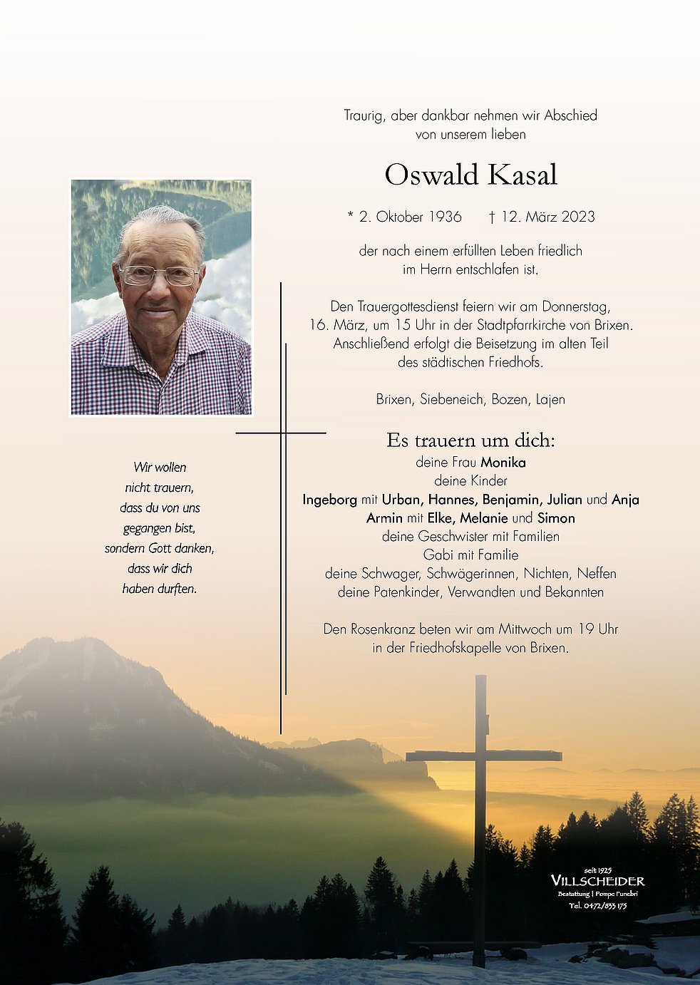 Begräbnisgottesdienst: 16.03. - 15:00 Uhr Brixen