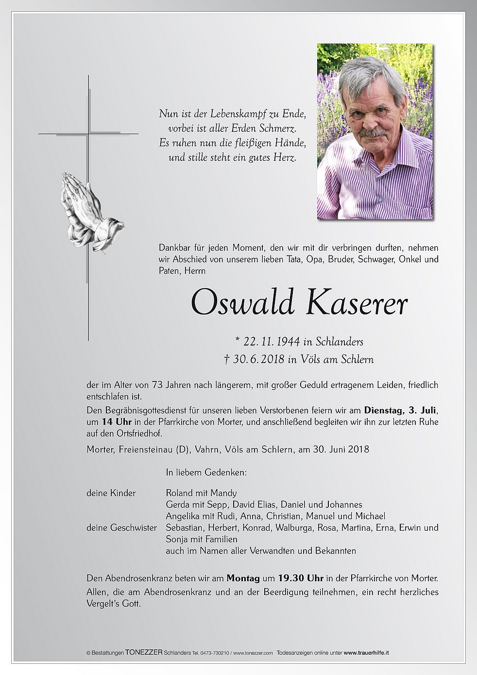 Den Begräbnisgottesdienst für unseren lieben Verstorbenen feiern wir am Dienstag, 3. Juli, um 14 Uhr in der Pfarrkirche von Morter, und anschließend begleiten wir ihn zur letzten Ruhe auf den Ortsfriedhof.