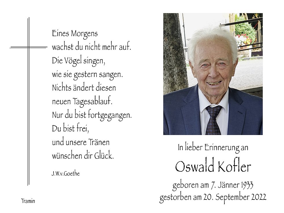 Den Trauergottesdienst feiern wir am Freitag, dem 23. September um 16.30 Uhr in der Pfarrkirche von Tramin. Anschließend begleiten wir unseren lieben Verstorbenen auf den Ortsfriedhof.