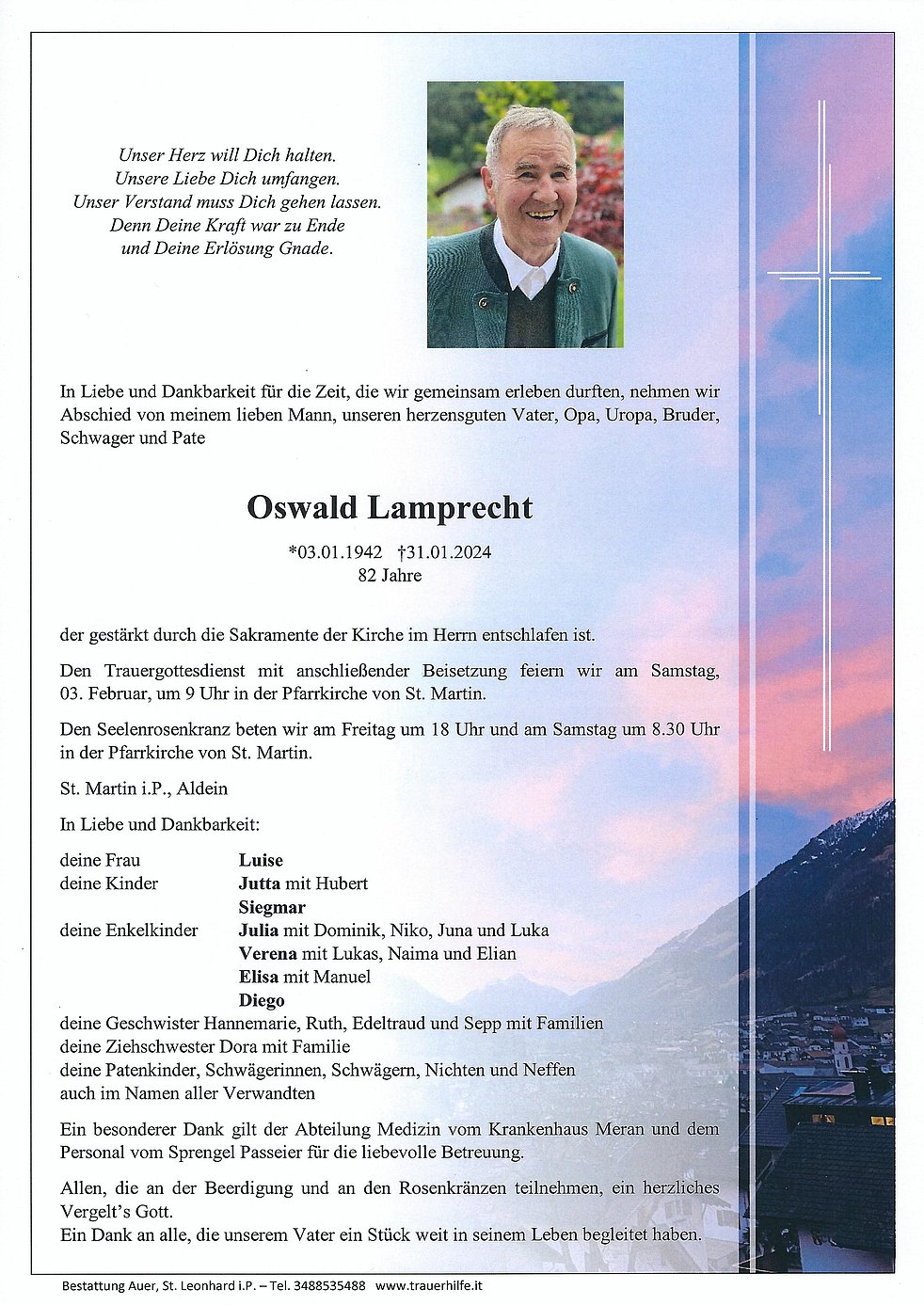 Den Trauergottesdienst mit anschließender Beisetzung feiern wir am Samstag, 03. Februar, um 9 Uhr in der Pfarrkirche von St. Martin.
