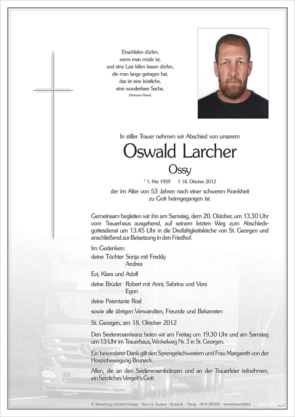 Gemeinsam begleiten wir ihn am Samstag, dem 20. Oktober, um 13.30 Uhr vom Trauerhaus ausgehend, auf seinem letzten Weg zum Abschieds-gottesdienst um 13.45 Uhr in die Dreifaltigkeitskirche von St. Georgen und anschließend zur Beisetzung in den Friedhof.