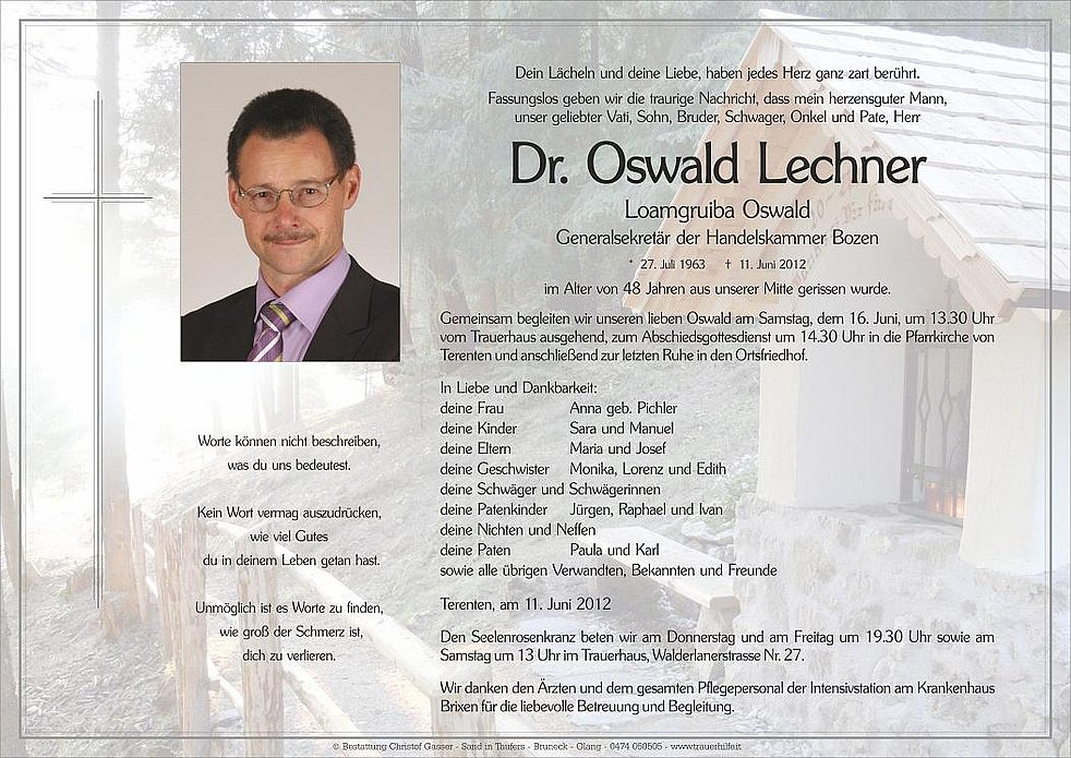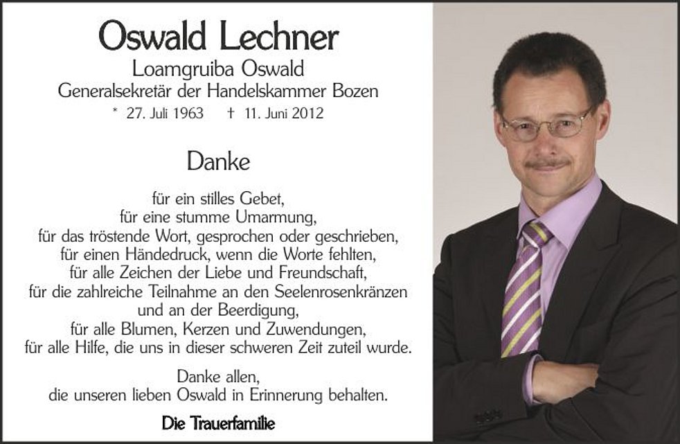Gemeinsam begleiten wir unseren lieben Oswald am Samstag, dem 16. Juni, um 13.30 Uhr vom Trauerhaus ausgehend, zum Abschiedsgottesdienst um 14.30 Uhr in die Pfarrkirche von Terenten und anschließend zur letzten Ruhe in den Ortsfriedhof.