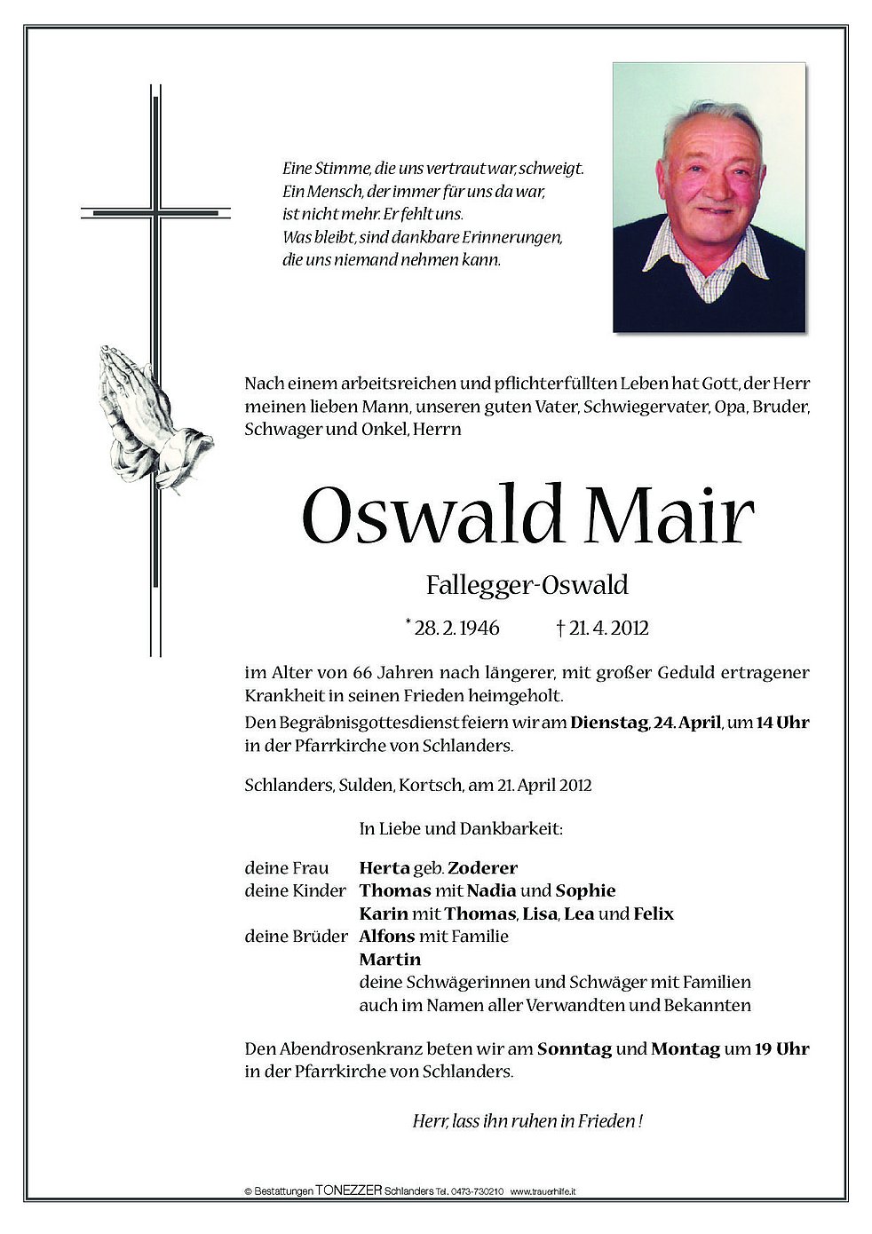 Den Begräbnisgottesdienst feiern wir am Dienstag, 24. April, um 14 Uhr in der Pfarrkirche von Schlanders.