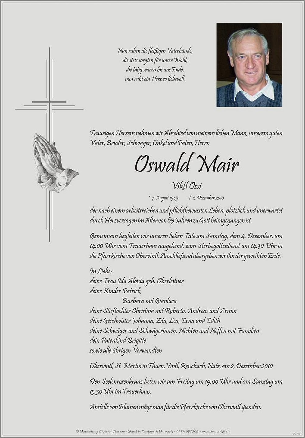 Anstelle von Blumen möge man für die Pfarrkirche von Obervintl spenden.