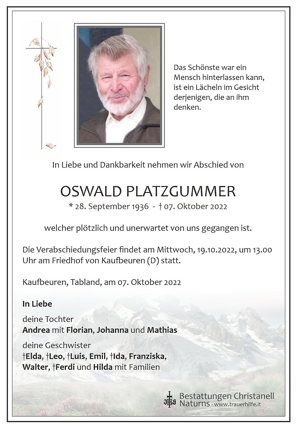 Die Verabschiedungsfeier findet am Mittwoch, 19.10.2022, um 13.00 Uhr am Friedhof von Kaufbeuren (D) statt.