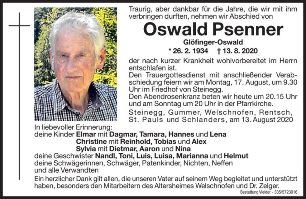 Ein herzlicher Dank gilt allen, die unseren Vater auf seinem Weg begleitet und unterstützt haben, besonders den Mitarbeitern des Altersheimes Welschnofen und Dr. Zelger.