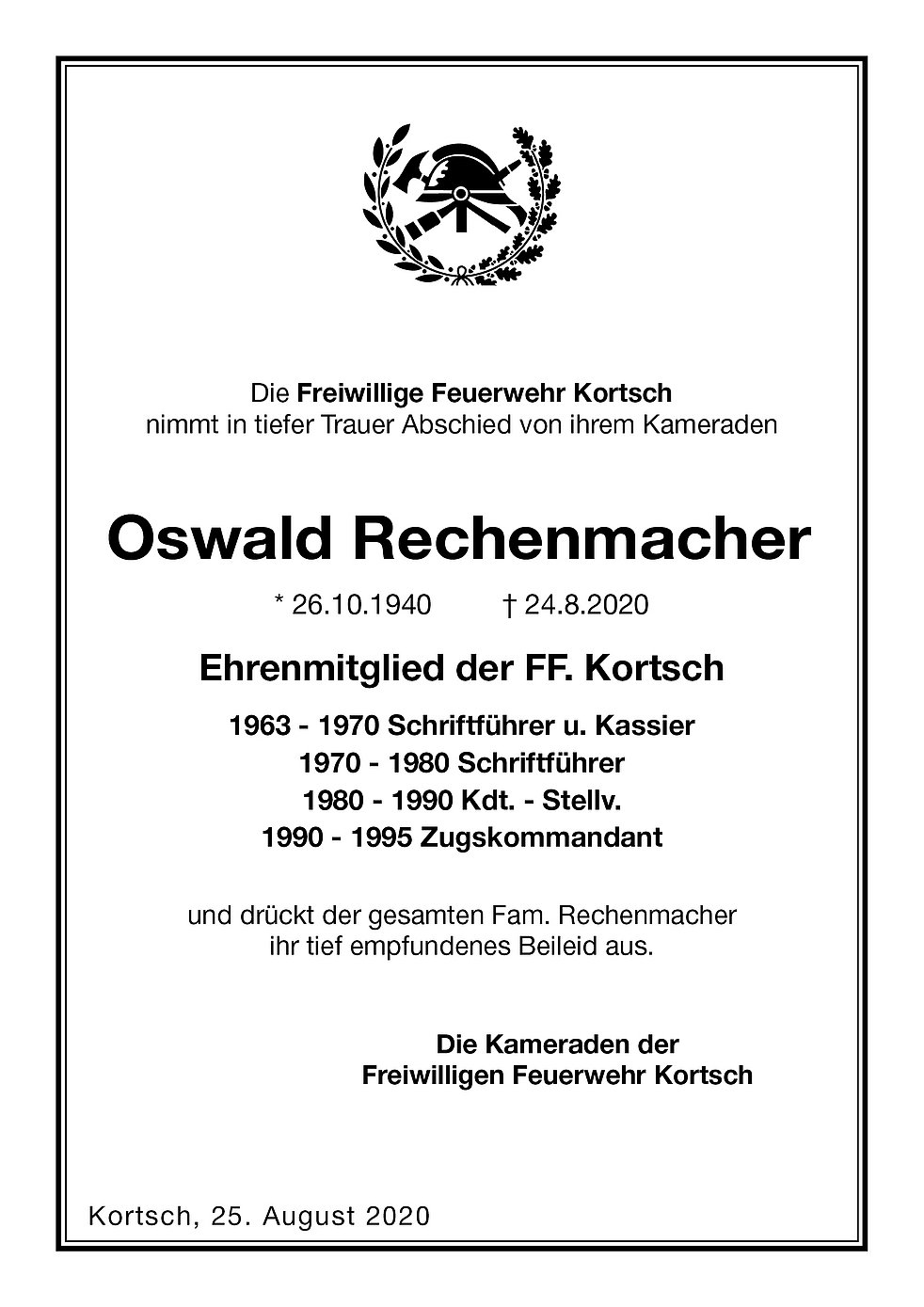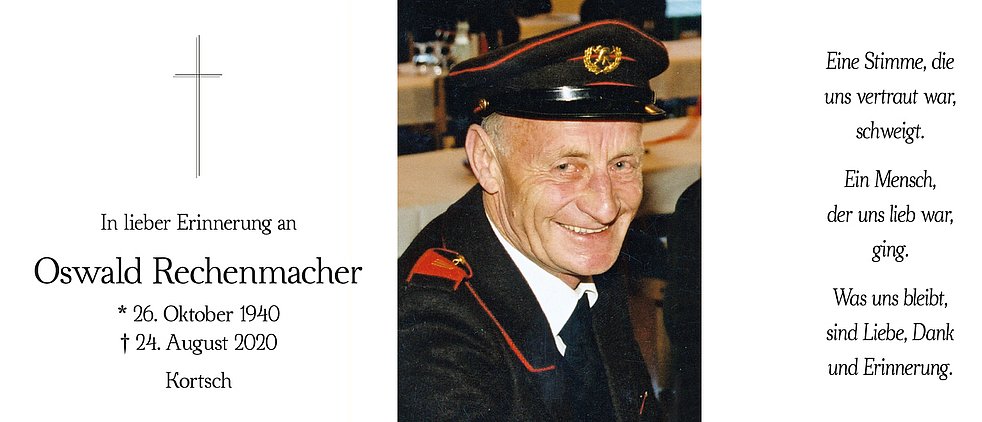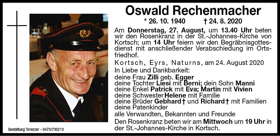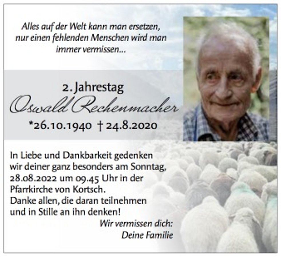 Am Donnerstag, 27. August, um 13.40 Uhr beten wir den Rosenkranz in der St.-Johannes-Kirche in Kortsch; um 14 Uhr feiern wir den Begräbnisgottesdienst mit anschließender Verabschiedung im Ortsfriedhof.