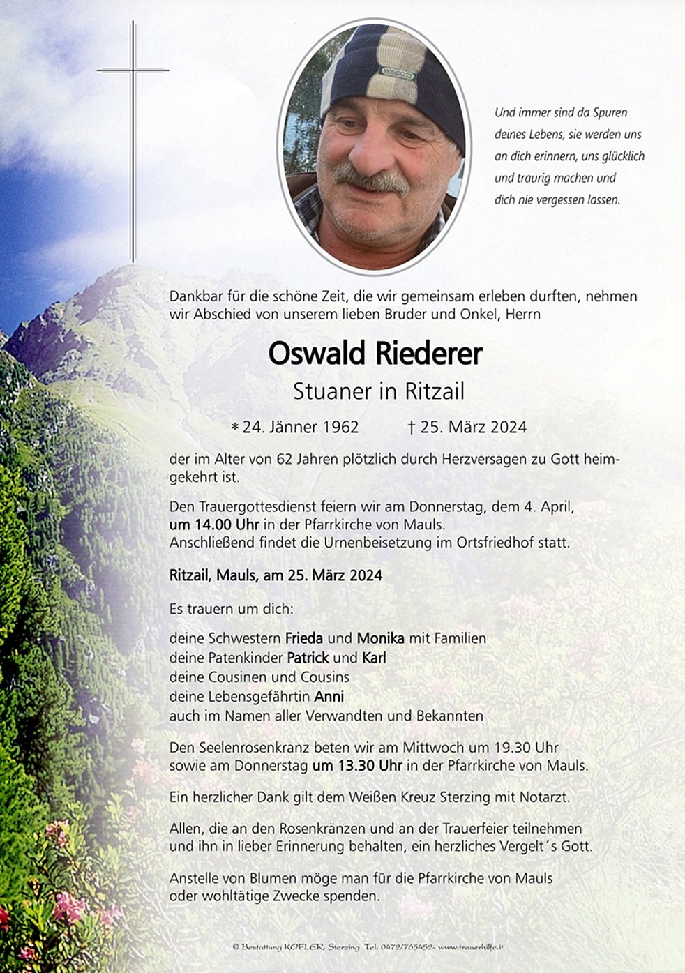 Anstelle von Blumen möge man für die Pfarrkirche von Mauls oder wohltätige Zwecke spenden.