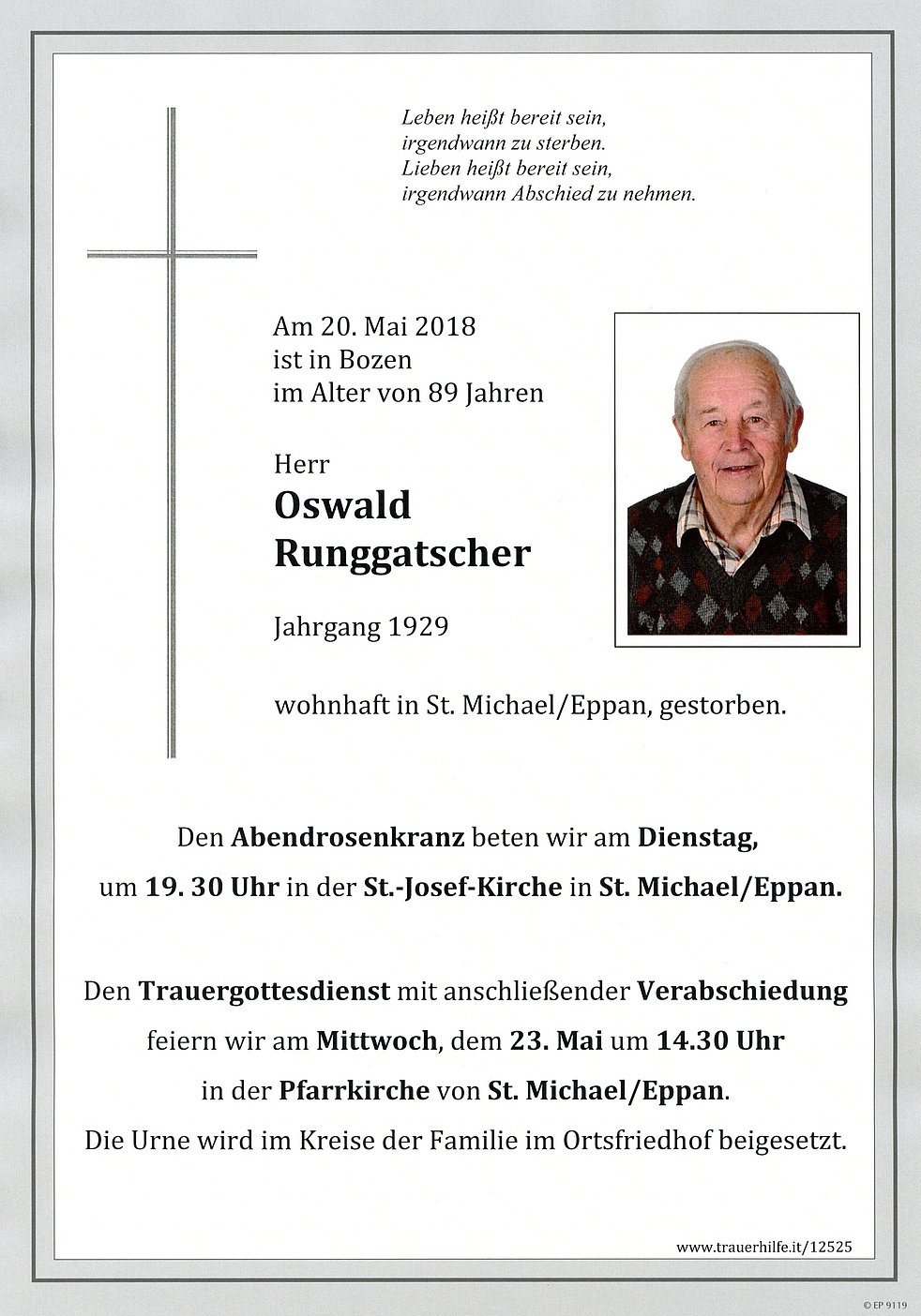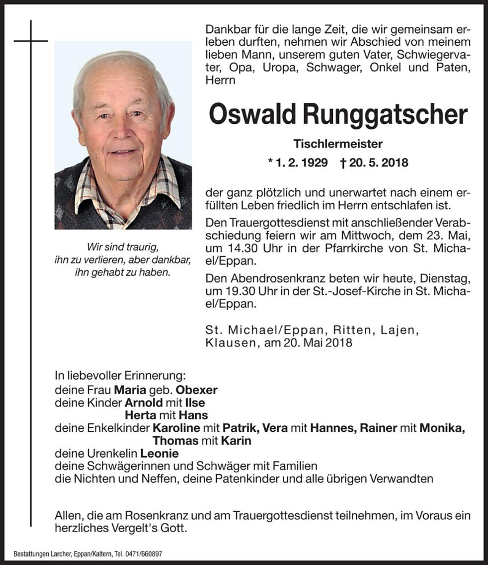 Den Trauergottesdienst mit anschließender Verabschiedung feiern wir am Mittwoch, dem 23. Mai um 14.30 Uhr in der Pfarrkirche von St. Michael/Eppan.