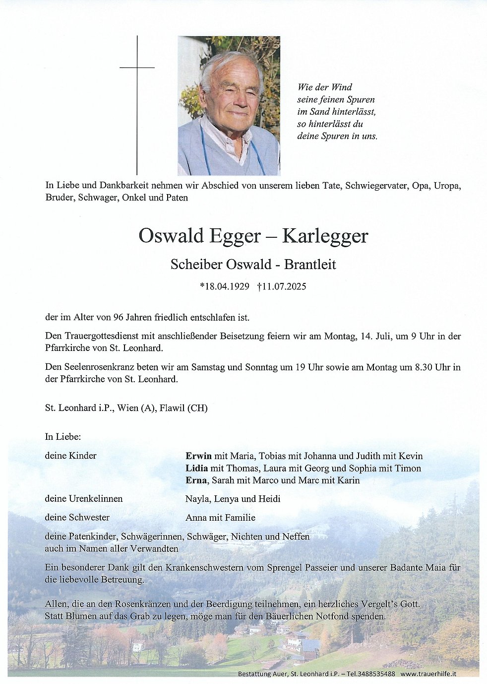 Den Trauergottesdienst mit anschließender Beisetzung feiern wir am Montag, 14. Juli, um 9 Uhr in der Pfarrkirche von St. Leonhard.
