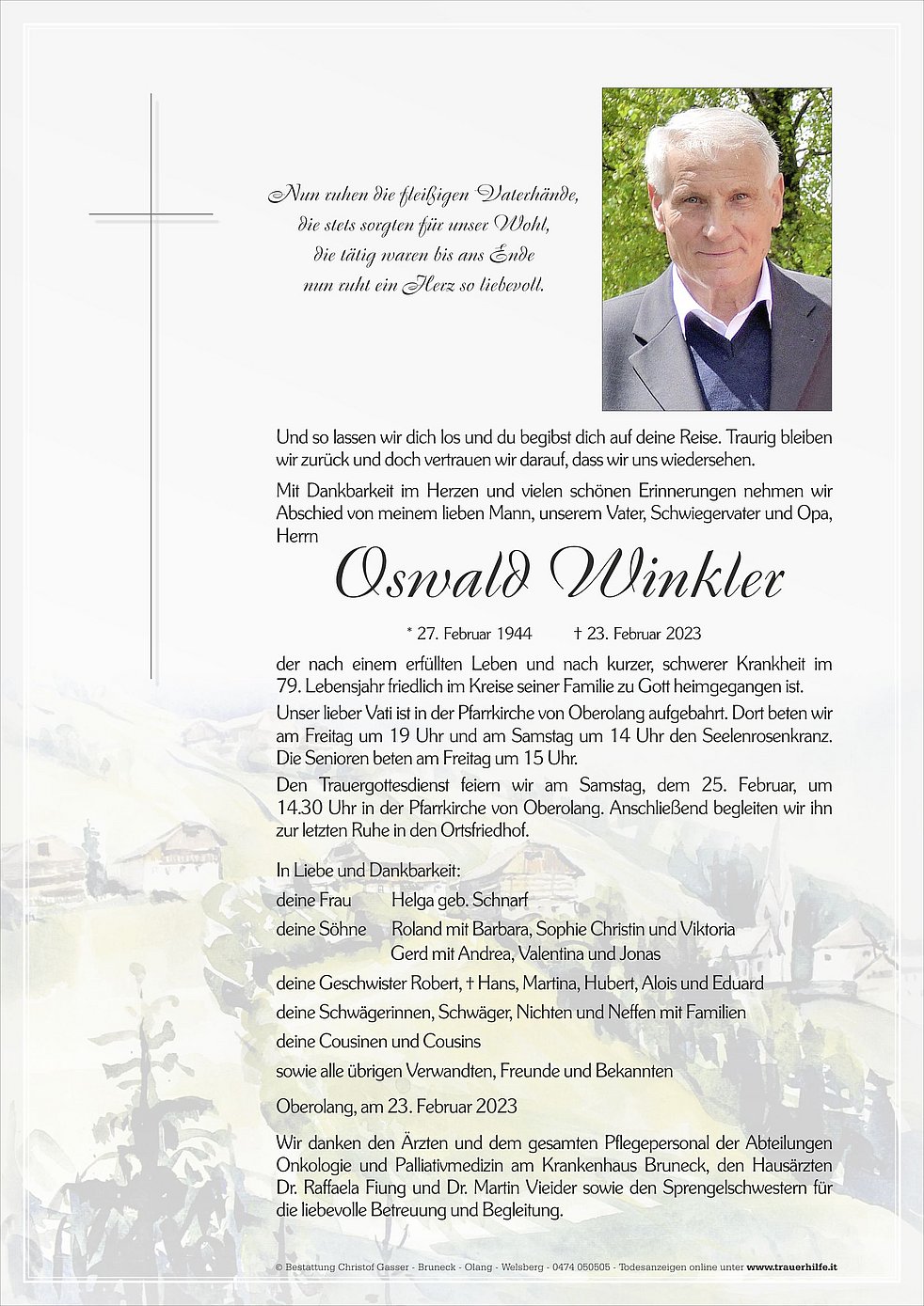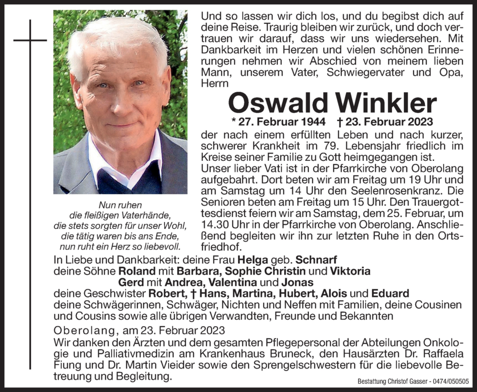 Den Trauergottesdienst feiern wir am Samstag, dem 25. Februar, um 14.30 Uhr in der Pfarrkirche von Oberolang. Anschließend begleiten wir ihn zur letzten Ruhe in den Ortsfriedhof.