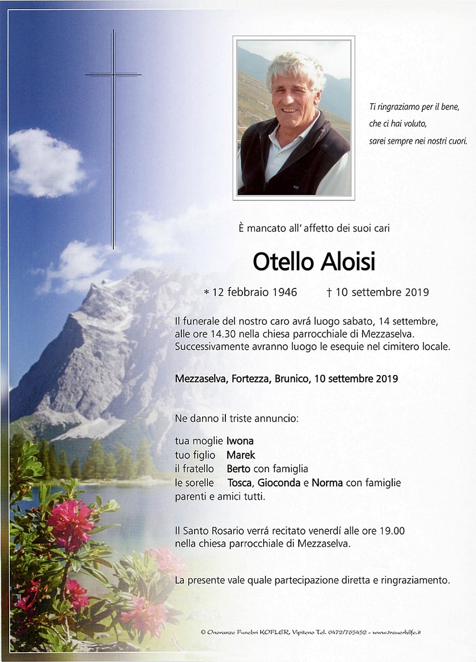 Il funerale del nostro caro avrá luogo sabato, 14 settembre, alle ore 14.30 nella chiesa parrocchiale di Mezzaselva. Successivamente avranno luogo le esequie nel cimitero locale.