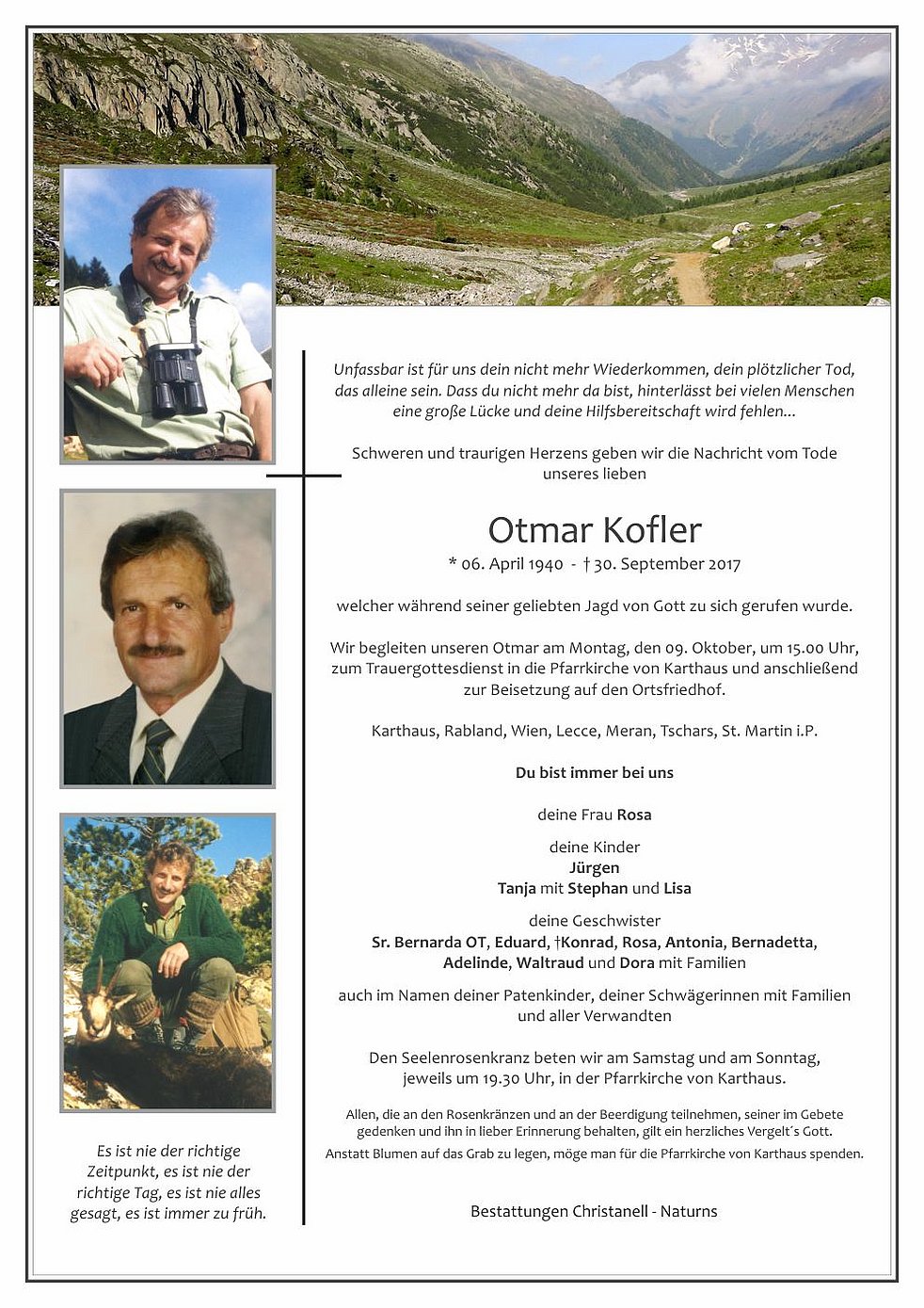 Wir begleiten unseren Otmar am Montag, den 09. Oktober, um 15.00 Uhr, zum Trauergottesdienst in die Pfarrkirche von Karthaus und anschließend zur Beisetzung auf den Ortsfriedhof.