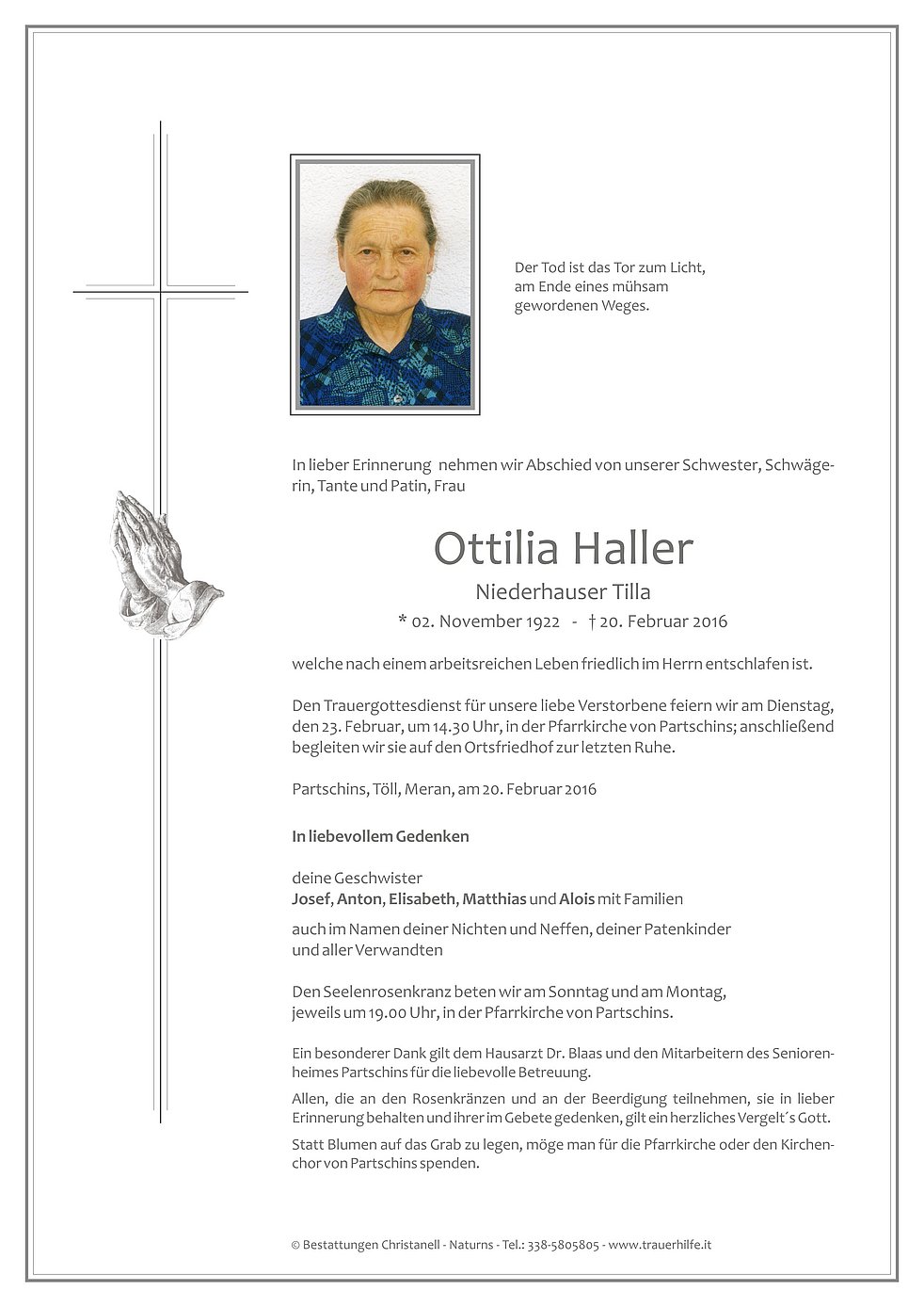 Den Trauergottesdienst für unsere liebe Verstorbene feiern wir am Dienstag, den 23. Februar, um 14.30 Uhr, in der Pfarrkirche von Partschins; anschließend begleiten wir sie auf den Ortsfriedhof zur letzten Ruhe.