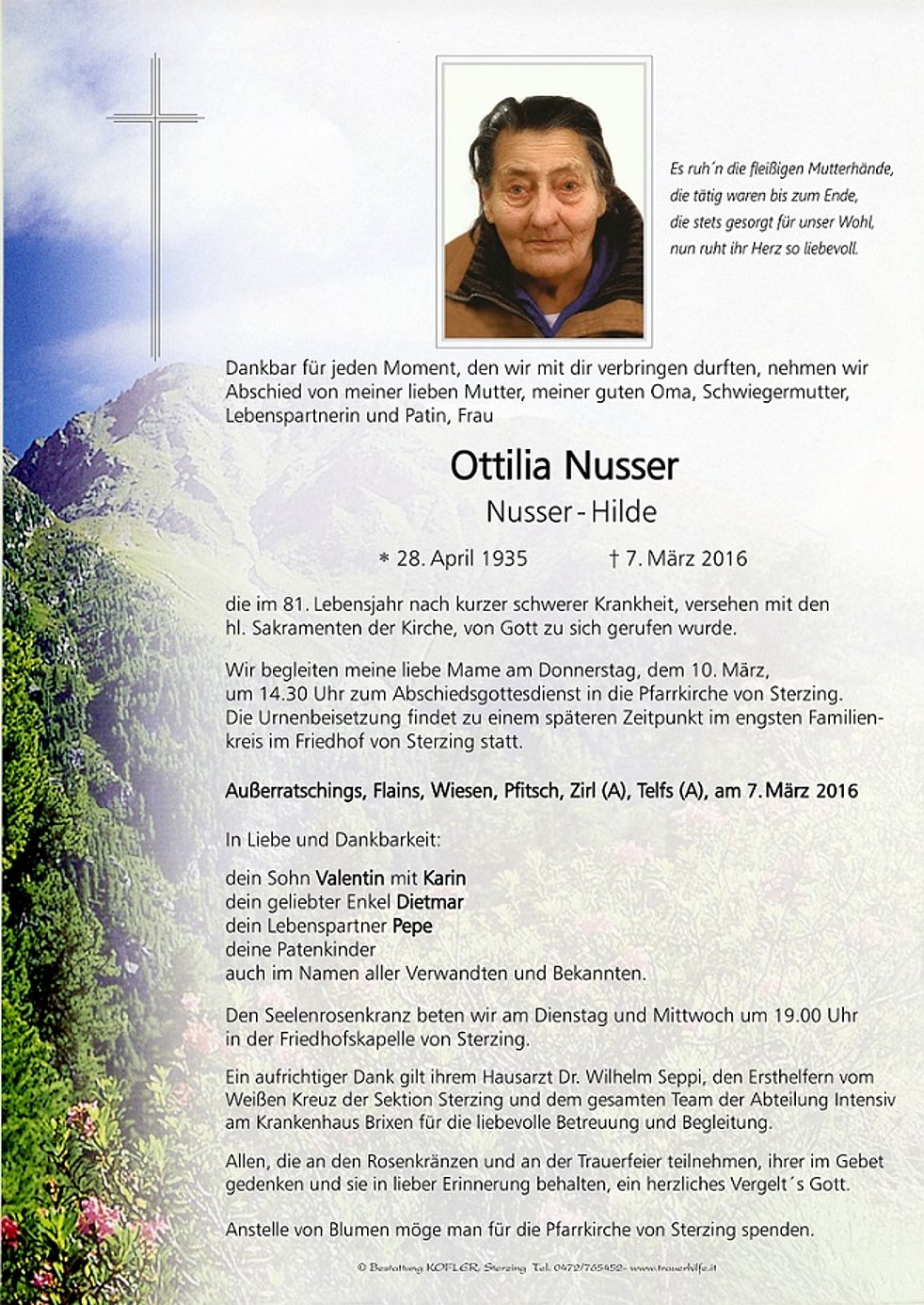 Anstelle von Blumen möge man für die Pfarrkirche von Sterzing spenden.