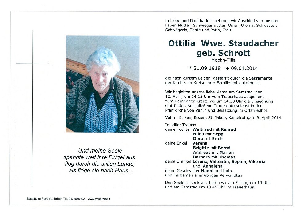 Wir begleiten unsere liebe Mama am Samstag, den 12. April, um 14.15 Uhr vom Trauerhaus ausgehend zum Hernegger-Kreuz, wo um 14.30 Uhr die Einsegnung stattfindet. Anschließend Trauergottesdienst in der Pfarrkirche von Vahrn und Beisetzung im Ortsfriedhof.