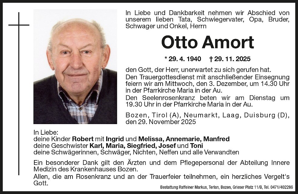 Den Trauergottesdienst mit anschließender Einsegnung feiern wir am Mittwoch, den 3. Dezember, um 14.30 Uhr in der Pfarrkirche Maria in der Au.