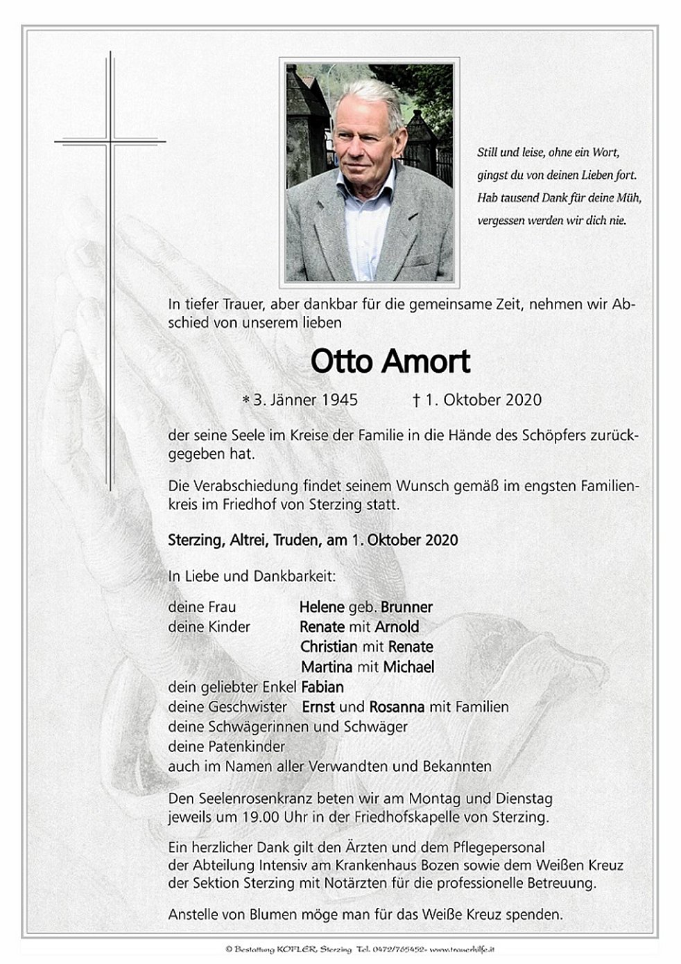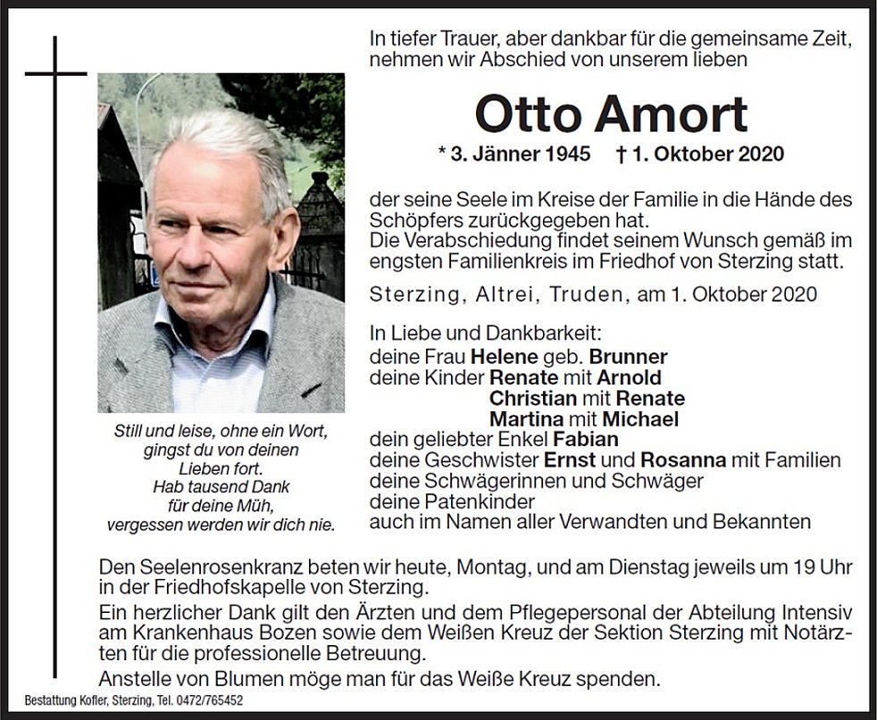Die Verabschiedung findet seinem Wunsch gemäß im engsten Familienkreis im Friedhof von Sterzing statt.