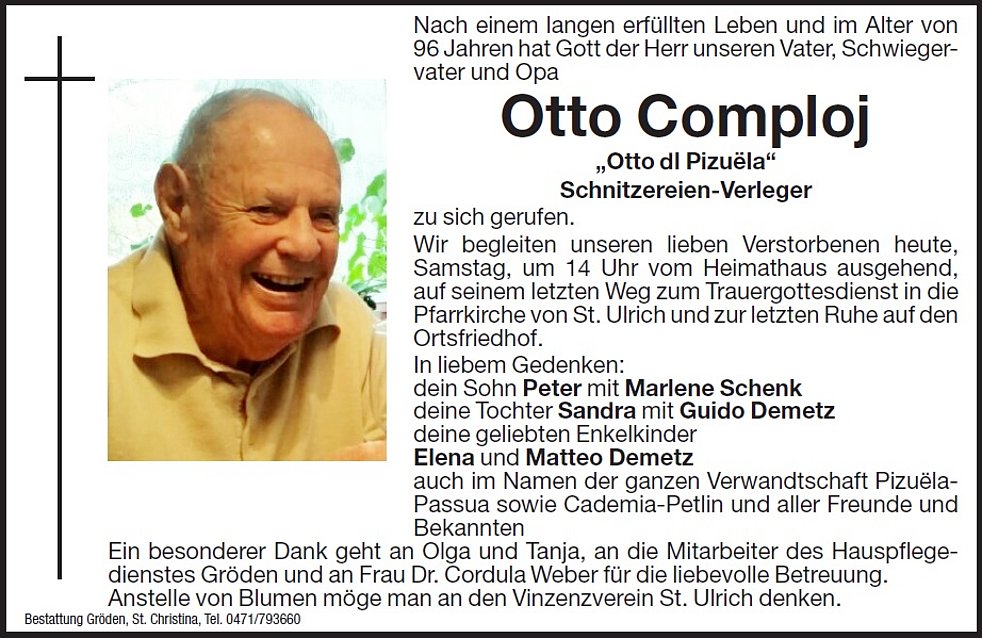 Wir begleiten unseren lieben Verstorbenen morgen Samstag, um 14 Uhr vom Heimathaus ausgehend, auf seinem letzten Weg zum Trauergottesdienst in die Pfarrkirche von St. Ulrich und zur letzten Ruhe auf den Ortsfriedhof.