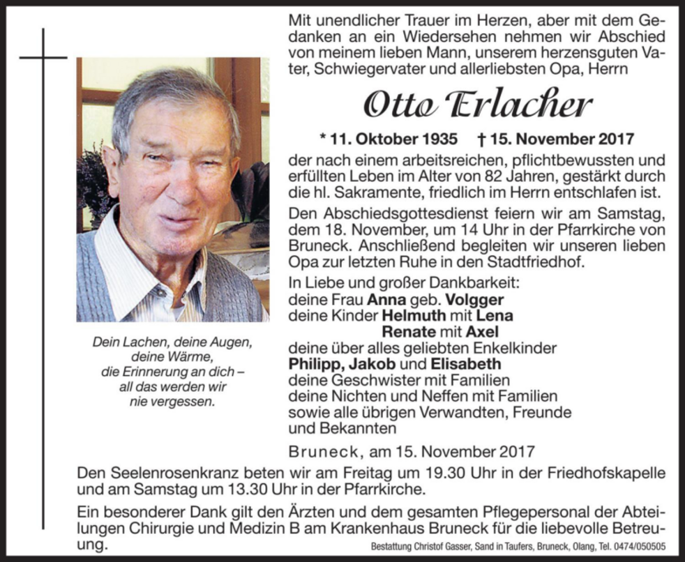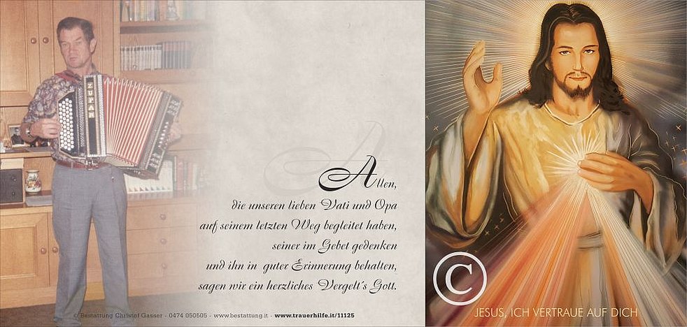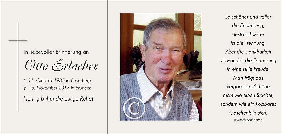 Den Abschiedsgottesdienst feiern wir am Samstag, dem 18. November, um 14 Uhr in der Pfarrkirche von Bruneck. Anschließend begleiten wir unseren lieben Opa zur letzten Ruhe in den Stadtfriedhof.
