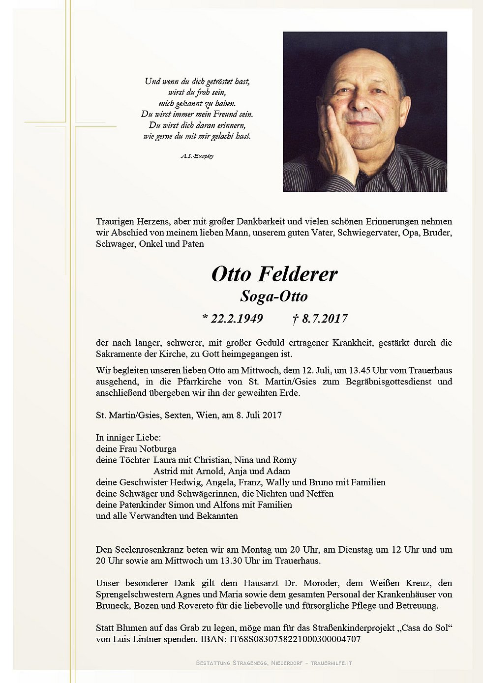 Wir begleiten unseren lieben Otto am Mittwoch, dem 12. Juli, um 13.45 Uhr vom Trauerhaus ausgehend, in die Pfarrkirche von St. Martin/Gsies zum Begräbnisgottesdienst und anschließend übergeben wir ihn der geweihten Erde.