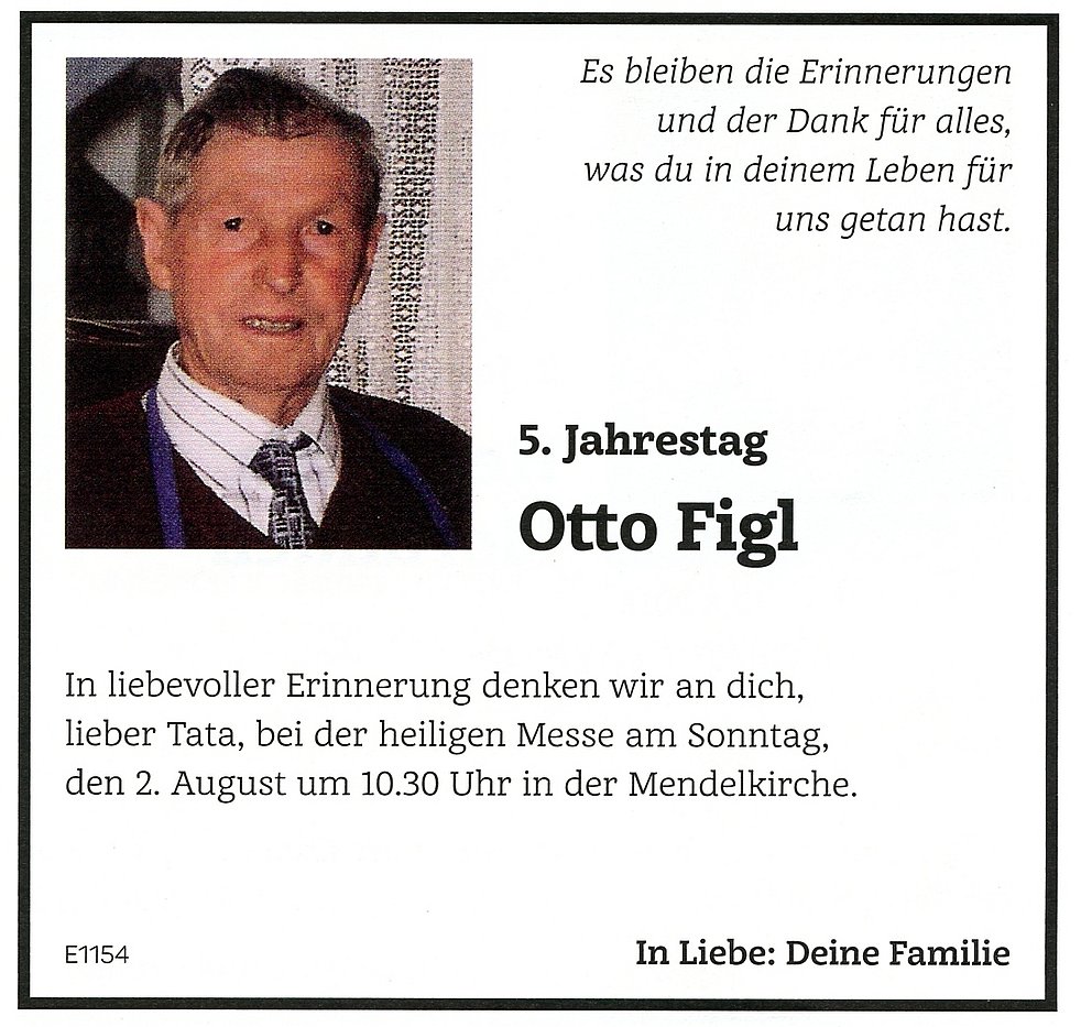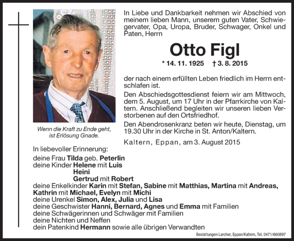 Den Abschiedsgottesdienst feiern wir am Mittwoch, den 5. August um 17 Uhr in der Pfarrkirche von Kaltern. Anschließend begleiten wir unseren lieben Verstorbenen auf den Ortsfriedhof.