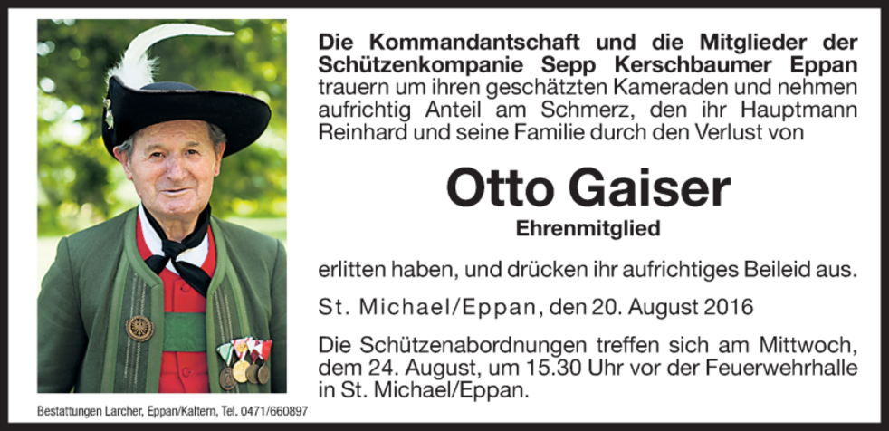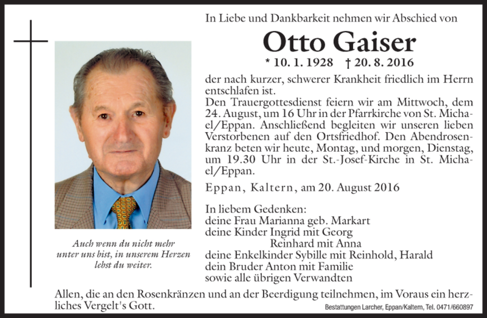 Den Trauergottesdienst feiern wir am Mittwoch, dem 24. August um 16 Uhr in der Pfarrkirche von St. Michael/Eppan. Anschließend begleiten wir unseren lieben Verstorbenen auf den Ortsfriedhof.