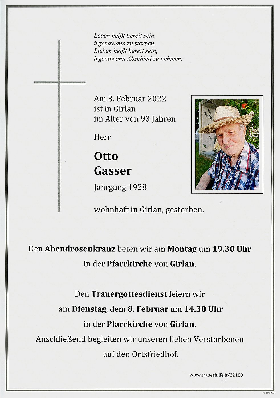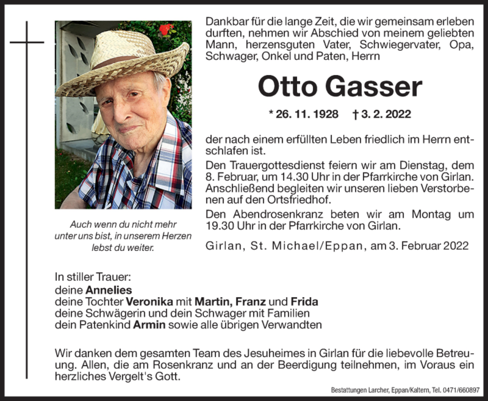 Den Trauergottesdienst feiern wir am Dienstag, dem 8. Februar um 14.30 Uhr in der Pfarrkirche von Girlan.