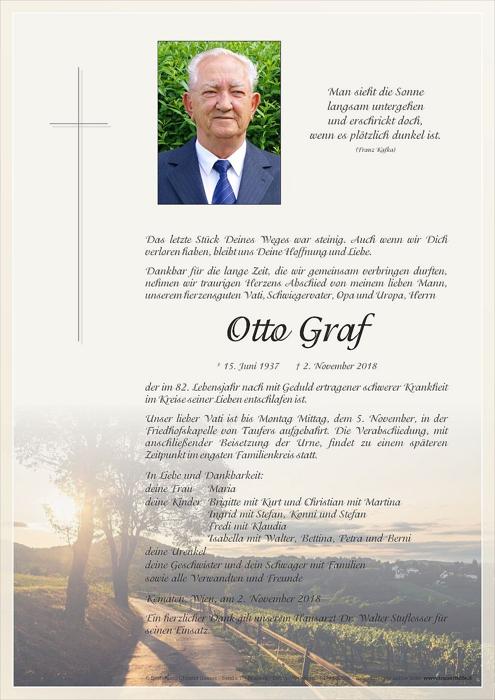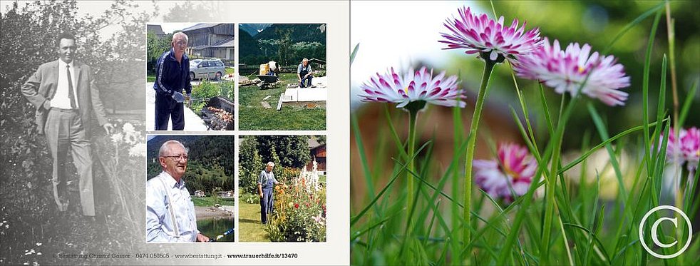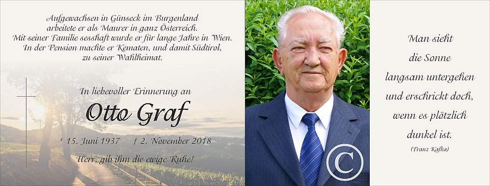 Unser lieber Vati ist bis Montag Mittag, dem 5. November, in der Friedhofskapelle von Taufers aufgebahrt. Die Verabschiedung, mit anschließender Beisetzung der Urne, findet zu einem späteren Zeitpunkt im engsten Familienkreis statt.