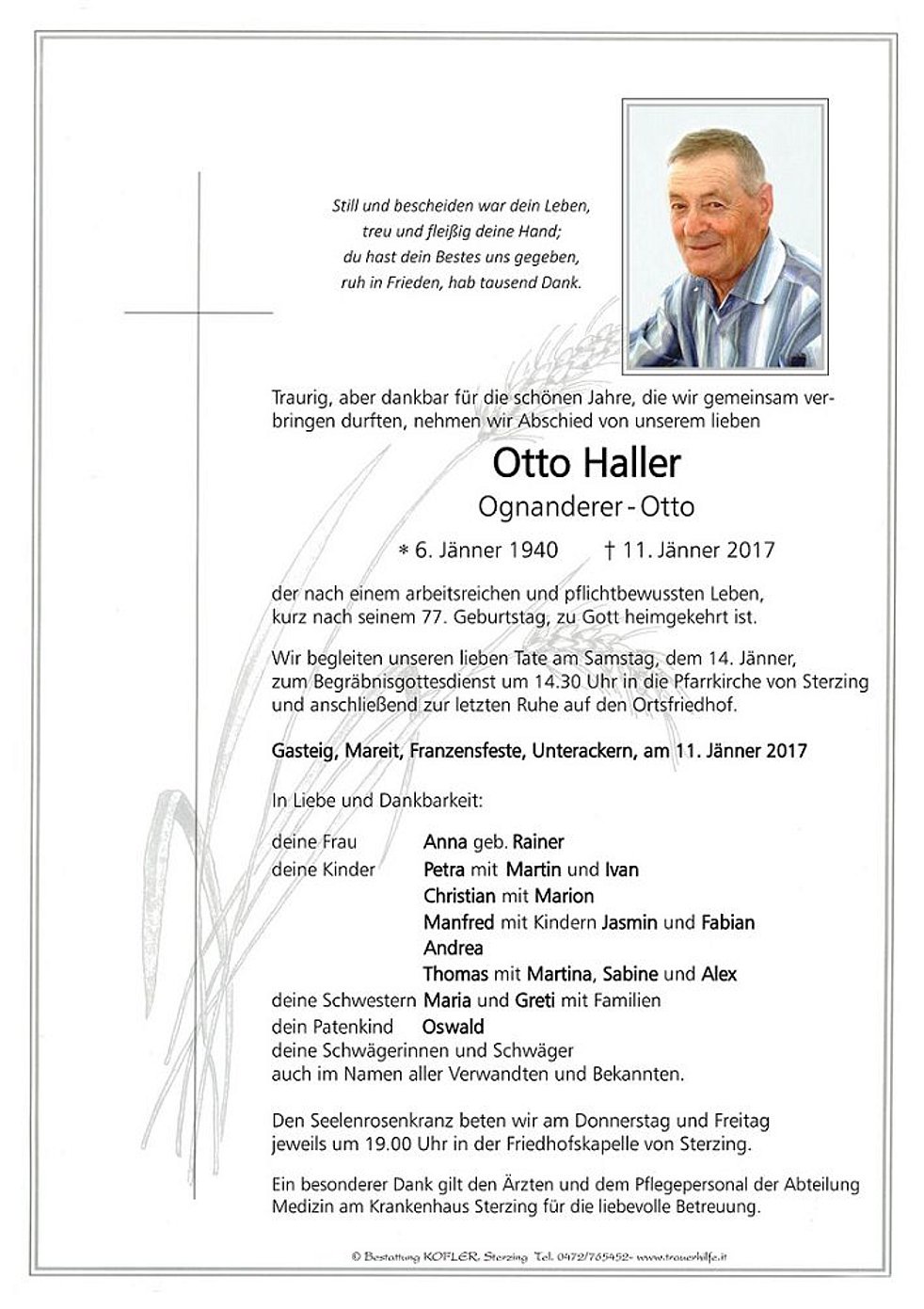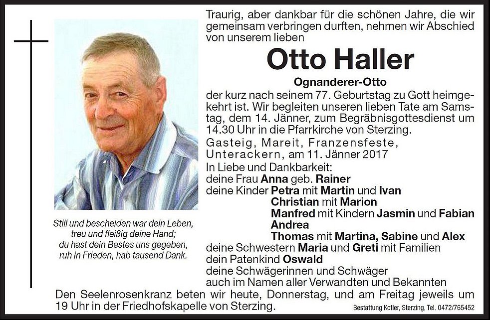 Wir begleiten unseren lieben Tate am Samstag, dem 14. Jänner, zum Begräbnisgottesdienst um 14.30 Uhr in die Pfarrkirche von Sterzing und anschließend zur letzten Ruhe auf den Ortsfriedhof.