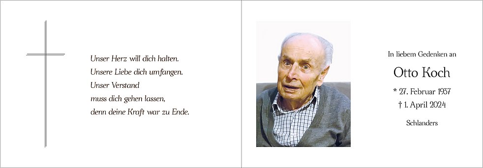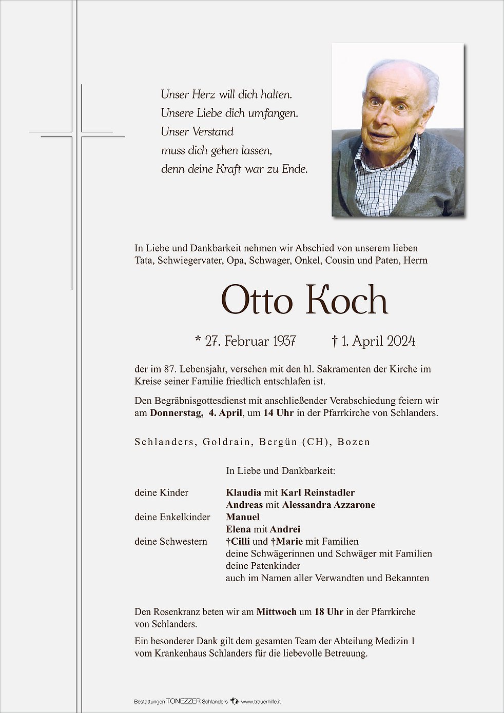 Den Begräbnisgottesdienst mit anschließender Verabschiedung feiern wir am Donnerstag, 4. April, um 14 Uhr in der Pfarrkirche von Schlanders.