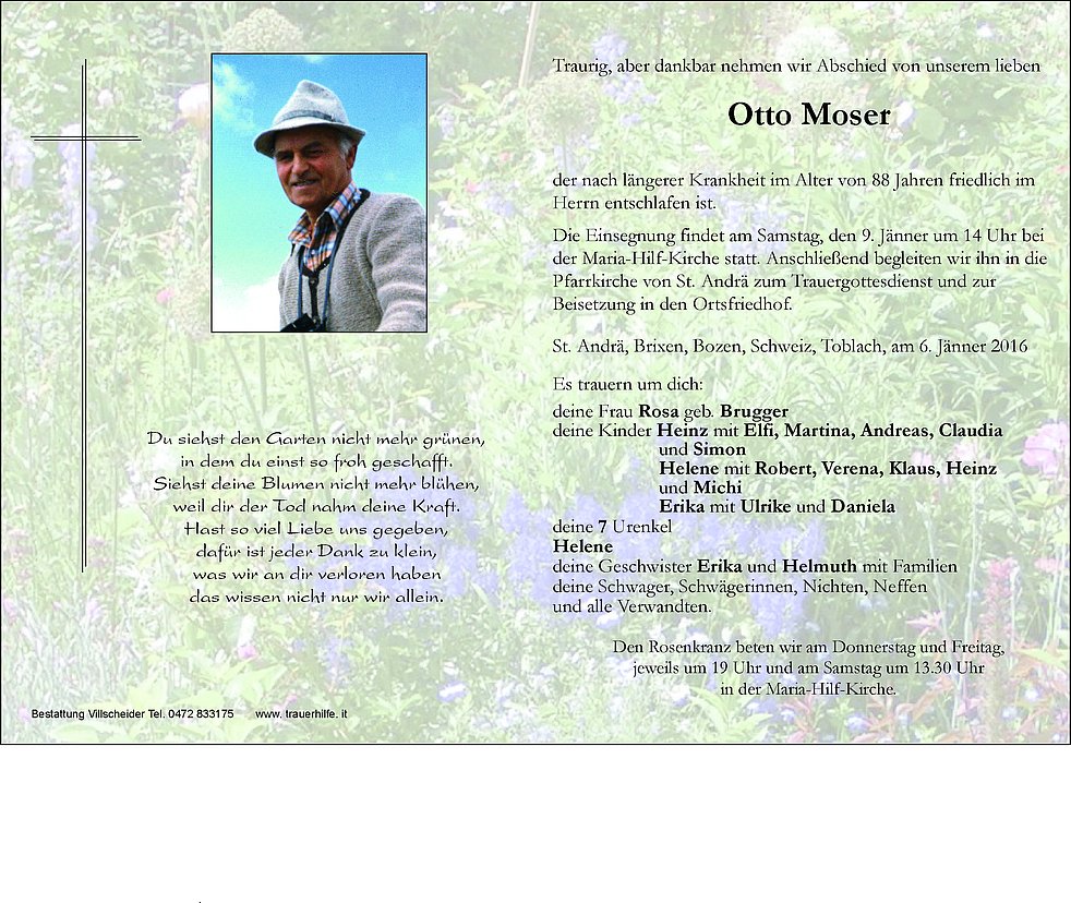 Die Einsegnung findet am Samstag, den 9. Jänner um 14 Uhr bei der Maria-Hilf-Kirche statt. Anschließend begleiten wir ihn in die Pfarrkirche von St. Andrä zum Trauergottesdienst und zur Beisetzung in den Ortsfriedhof.