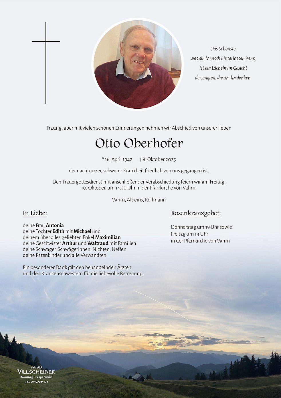 Liebe Familie Oberhofer, liebe Tone, mit Erschütterung haben wir vom Ableben des lieben Otto erfahren. Viele schoene Erinnerungen an ihn und vor allem in den schoenen Fotos die er gemacht hat wird er in unserer Wandergruppe immer bei uns sein. Wir trauern mit euch um einen liebenswerten Kollegen der, zwar unsichtbar, immer bei unseren Wanderungen in unserer Mitte sein wird. Wir trauern mit euch und möchten euch unser tief empfundenes Beileid aussprechen. Die Wandergruppe