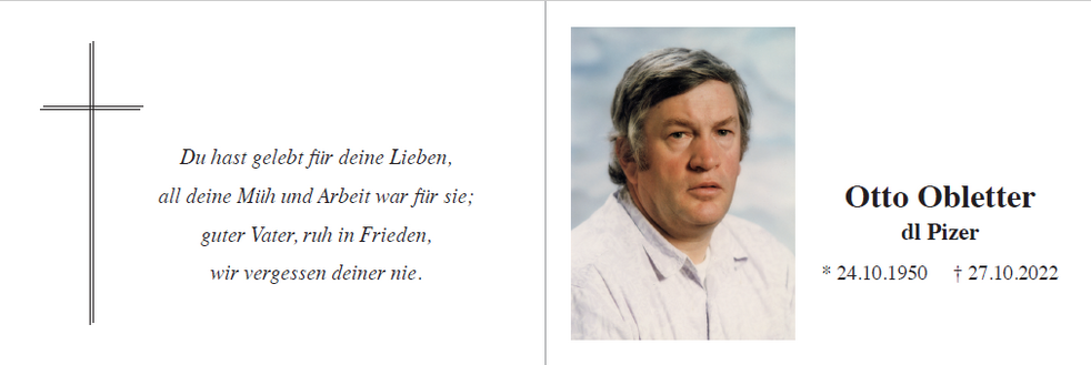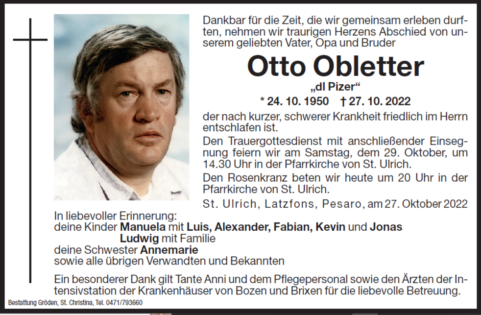 Den Trauergottesdienst mit anschließender Einsegnung feiern wir am Samstag, dem 29. Oktober, um 14.30 Uhr in der Pfarrkirche von St. Ulrich.