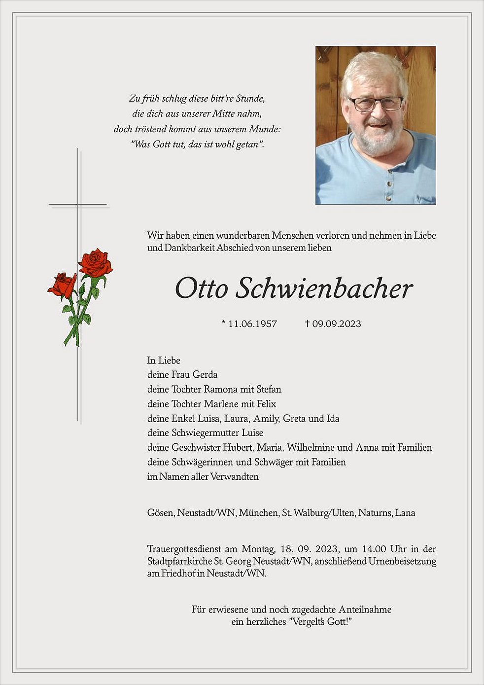 Trauergottesdienst am Montag, 18. 09. 2023, um 14.00 Uhr in der Stadtpfarrkirche St. Georg Neustadt/WN, anschließend Urnenbeisetzung am Friedhof in Neustadt/WN.