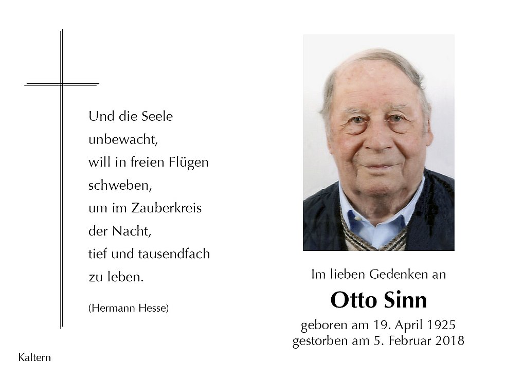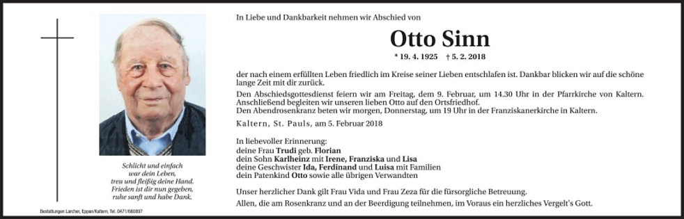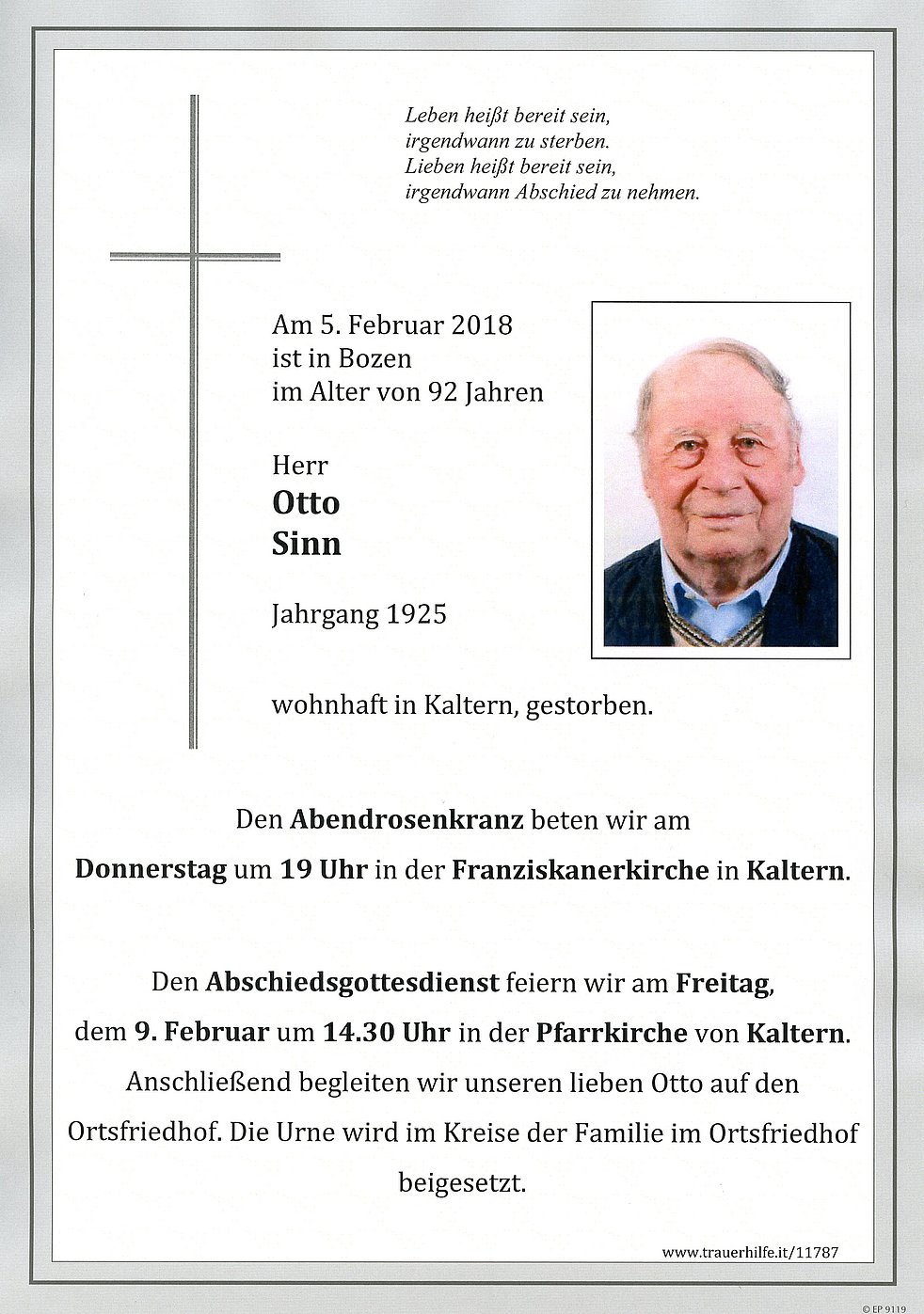 Den Abschiedsgottesdienst feiern wir am Freitag, dem 9. Februar um 14.30 Uhr in der Pfarrkirche von Kaltern. Anschließend begleiten wir unseren lieben Otto auf den Ortsfriedhof.
