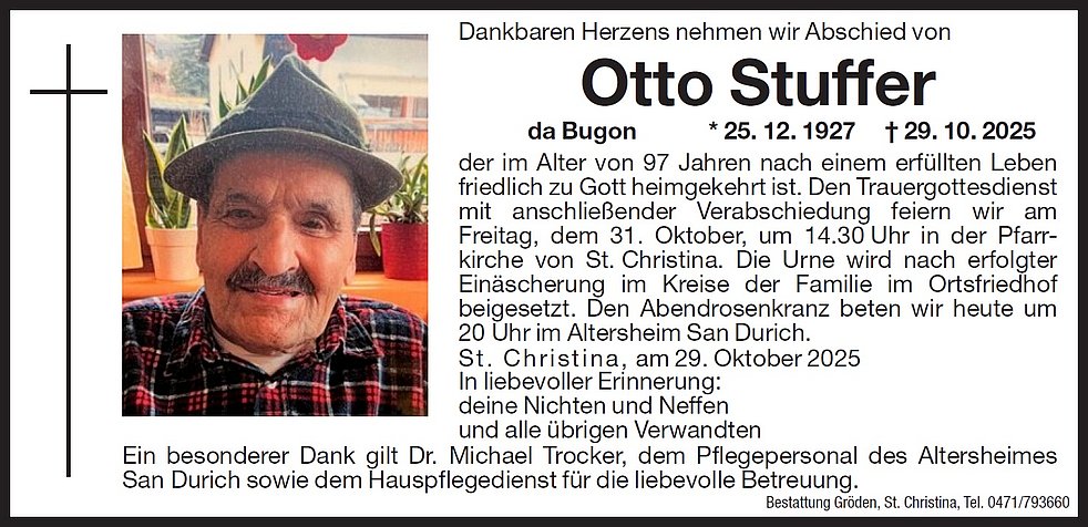 Den Trauergottesdienst mit anschließender Verabschiedung feiern wir am Freitag, dem 31. Oktober, um 14.30 Uhr in der Pfarrkirche von St. Christina. Die Urne wird nach erfolgter Einäscherung im Kreise der Familie im Ortsfriedhof beigesetzt.