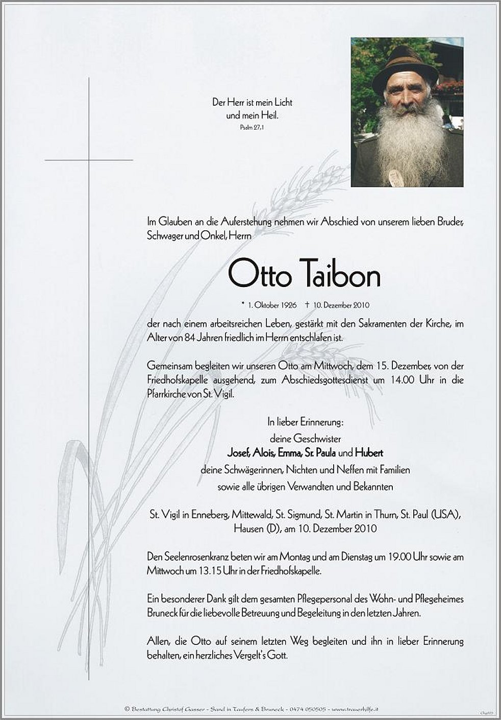 Gemeinsam begleiten wir unseren Otto am Mittwoch, dem 15. Dezember, von der Friedhofskapelle ausgehend, zum Abschiedsgottesdienst um 14.00 Uhr in die Pfarrkirche von St. Vigil.