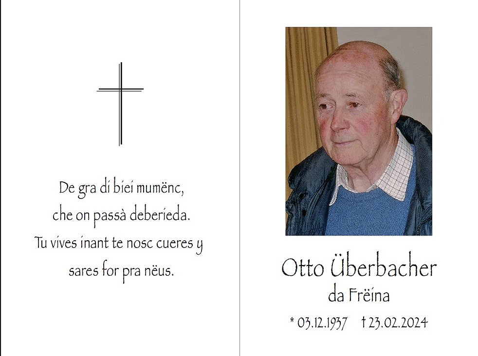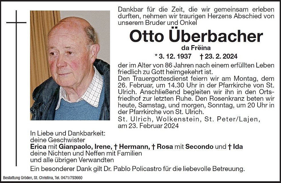 Den Trauergottesdienst feiern wir am Montag, dem 26. Februar, um 14.30 Uhr in der Pfarrkirche von St. Ulrich. Anschließend begleiten wir ihn in den Ortsfriedhof zur letzten Ruhe.