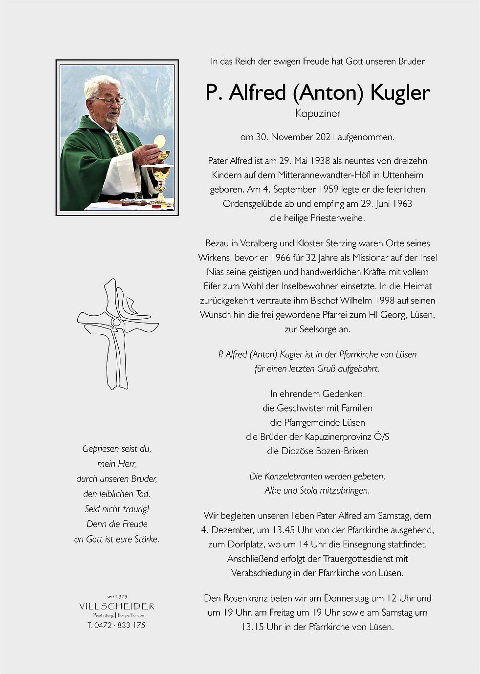 In dem Wissen, dass er zu Gott heimgegangen ist, nehmen wir Abschied von unserem langjährigen Seelsorger P. Alfred Kugler, der unsere Familien-Feiern stets mit bewundernswerten Worten begleitet hat.