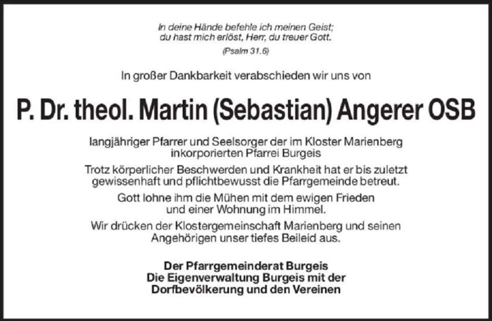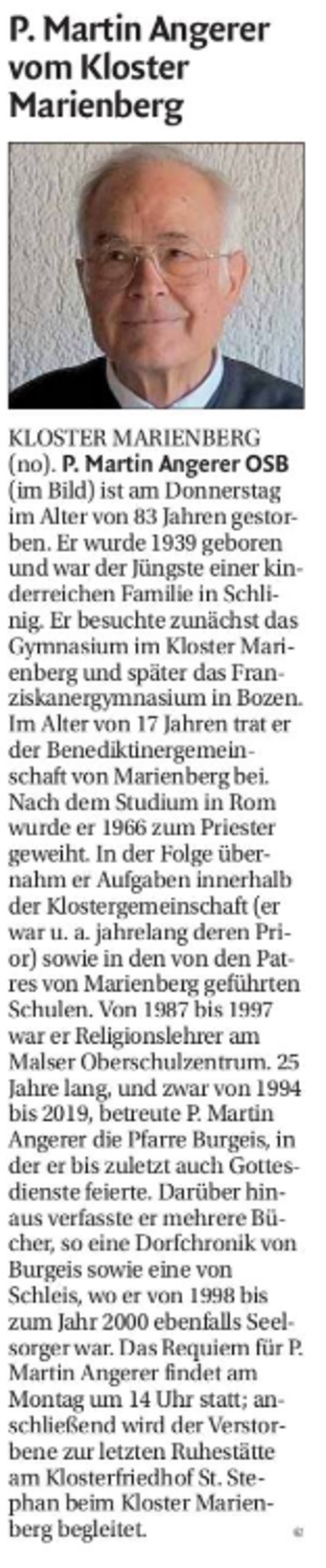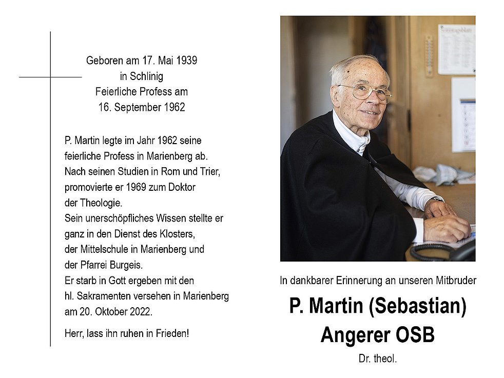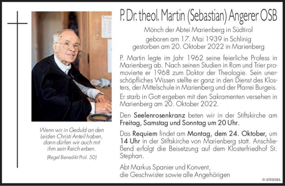 Das Pontifikalrequiem für den Verstorbenen feiern wir am Montag, 24.10.2022 um 14:00 Uhr mit Bischof Dr. Ivo Muser in der Klosterkirche